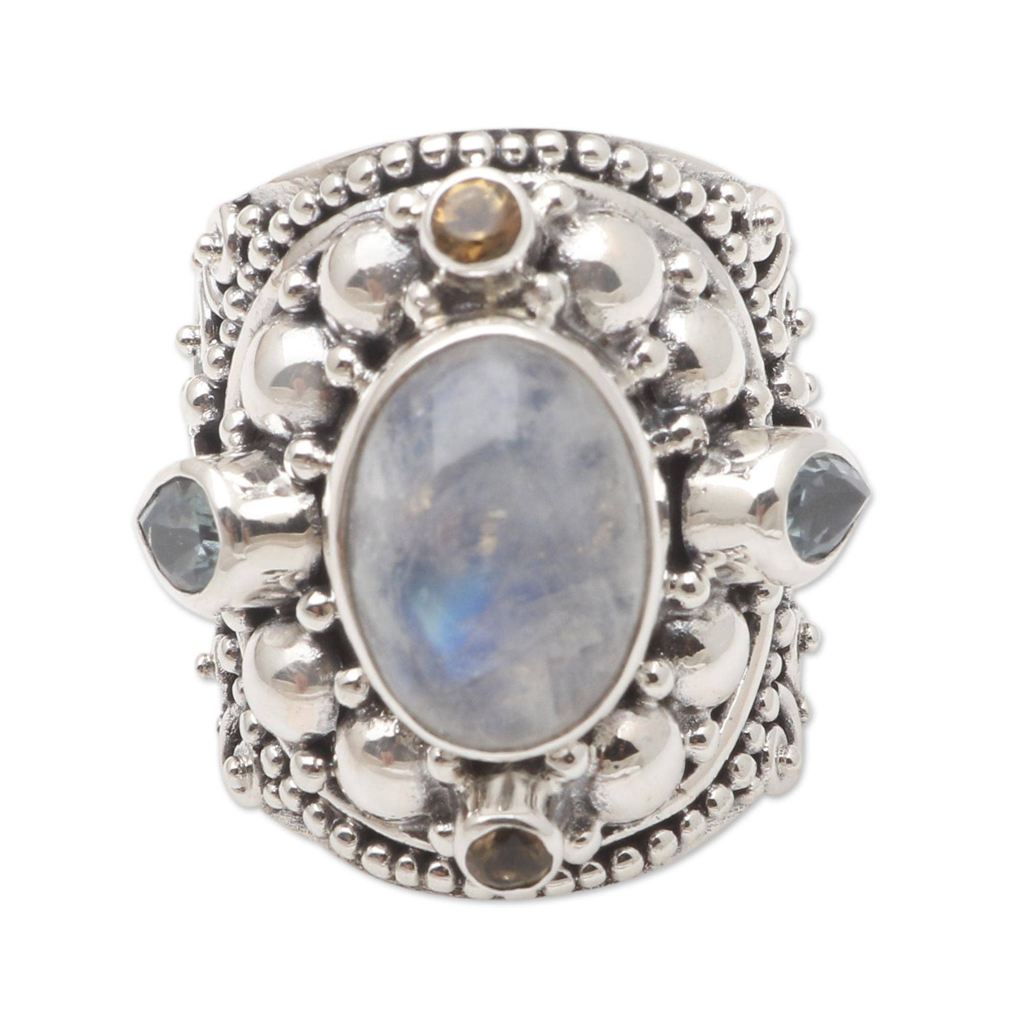 Bague médaillon rond en argent sterling avec pierre de lune arc-en-ciel en vente B2B