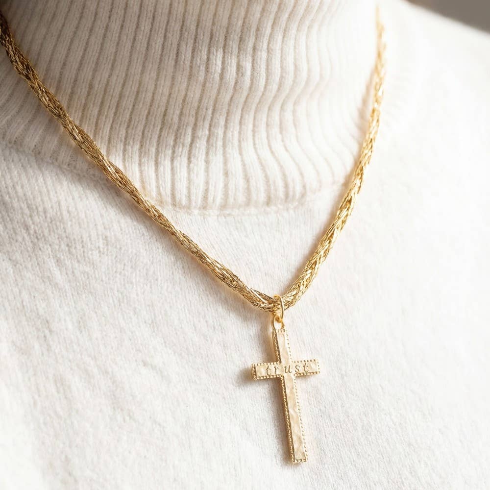 Ce collier croix simple et élégant très vendu est très flatteur et constitue le cadeau parfait pour montrer de l'amour à quelqu'un ou à vous-même. Il est forgé à la main à partir de fil d'or 14 carats et martelé avec une texture tachetée pour capter la lumière. La croix mesure 2 1/4 po de haut en bas et un peu moins de 1/2 po de diamètre. La chaîne est un câble fin en or 14 carats et est finie avec un fermoir à ressort et ma grande bague signature. La longueur est de 17 » mais je peux la faire à la longueur souhaitée. Également disponible en argent sterling