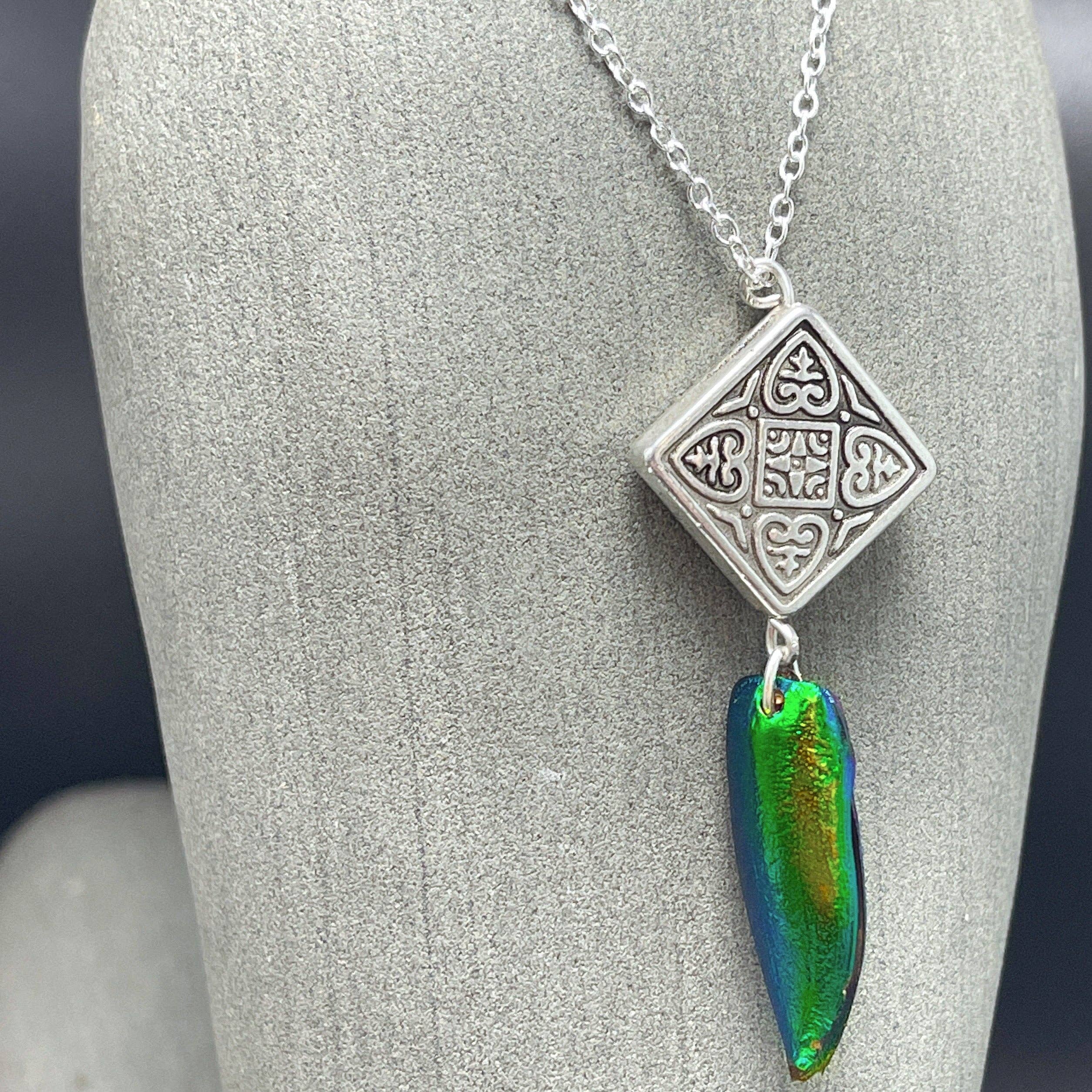 Les ailes de coléoptère bijou proviennent de la province de Sa Kaeo, dans le sud-est de la Thaïlande, à la frontière du Cambodge. Ces coléoptères tombent au sol à la fin de leur courte vie. Les agriculteurs locaux collectent ensuite les ailes de coléoptère pour fabriquer ces bijoux magnifiquement irisés, fournissant un revenu dans une région désespérément sous-employée. Nous apportons les matières premières à notre atelier pour créer des bijoux finis. Les ailes de coléoptère sont combinées avec de l'argent de Bali aux motifs complexes pour créer ces boucles d'oreilles. Crochets d'oreilles en argent sterling. Aucun coléoptère n'est blessé dans la fabrication de ces pièces, les ailes sont collectées après le cycle de vie naturel. Ces ailes ne sont en aucun cas traitées, la qualité irisée de l'aile est complètement naturelle.