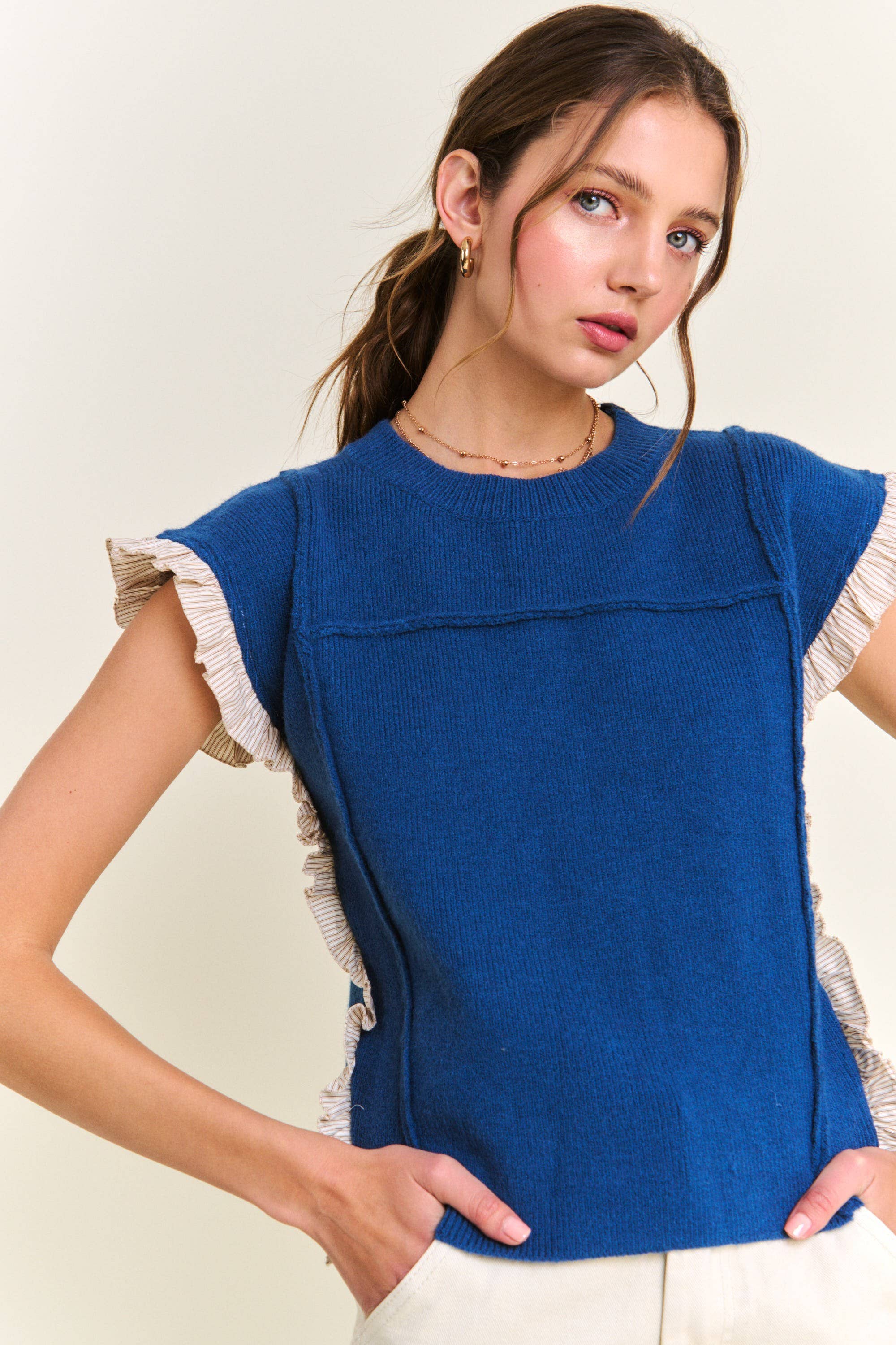 Pull sans manches à col roulé bleu marine/ivoire en vente B2B