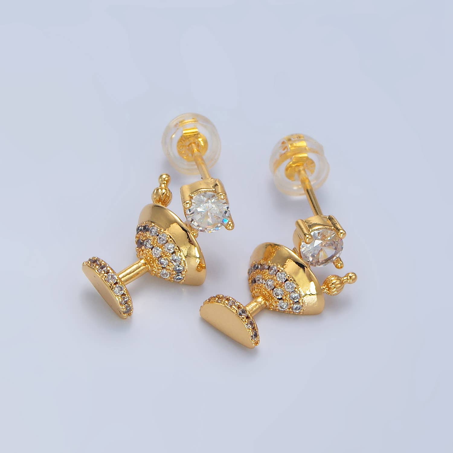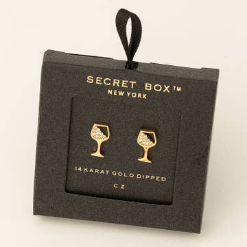 Boucles d'oreilles à tige en verre à vin en zircone cubique trempé dans l'or Secret Box en vente B2B