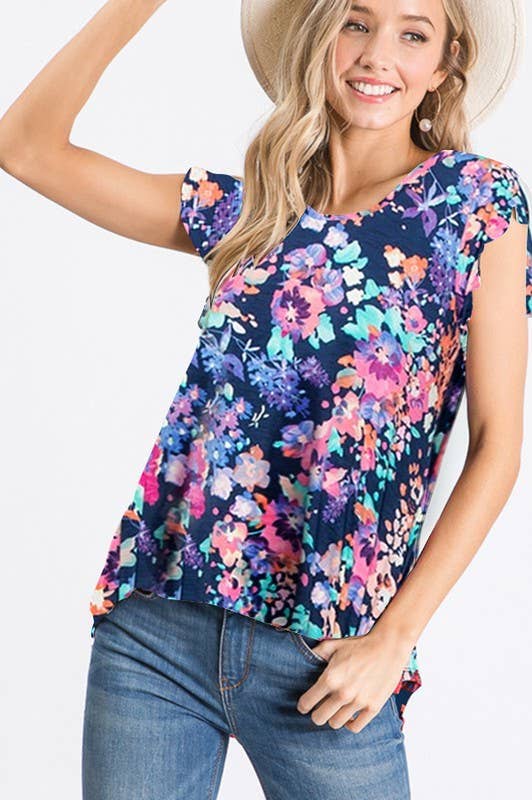 UN HAUT FLEURI DOTÉ D'UNE ENCOLURE EN V, D'UN BABYDOLL, DE MANCHES FLOTTANTES ET D'UNE COUPE DÉCONTRACTÉE. *LE MANNEQUIN PORTE LA TAILLE S