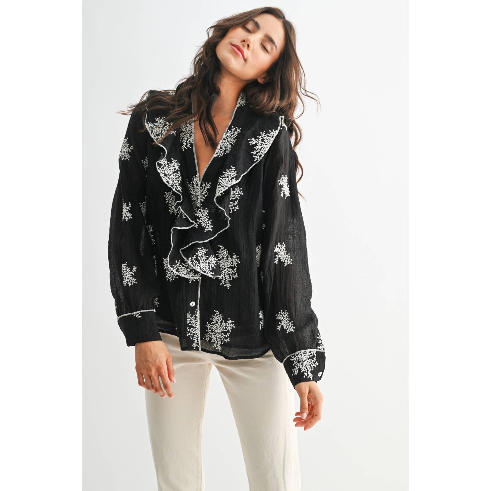 Cette chemise en jean à manches longues brodée allie style et confort, offrant un ajout polyvalent à votre garde-robe. Parfaite pour des sorties décontractées ou une journée au bureau, elle présente une broderie florale complexe qui ajoute de l'élégance à sa coupe décontractée. Le tissu en jean doux assure un confort tout au long de la journée, en faisant une pièce incontournable pour chaque saison. Le mannequin porte une taille S Mannequin : 5'9" - B 32" - T 24" - H 36.5"