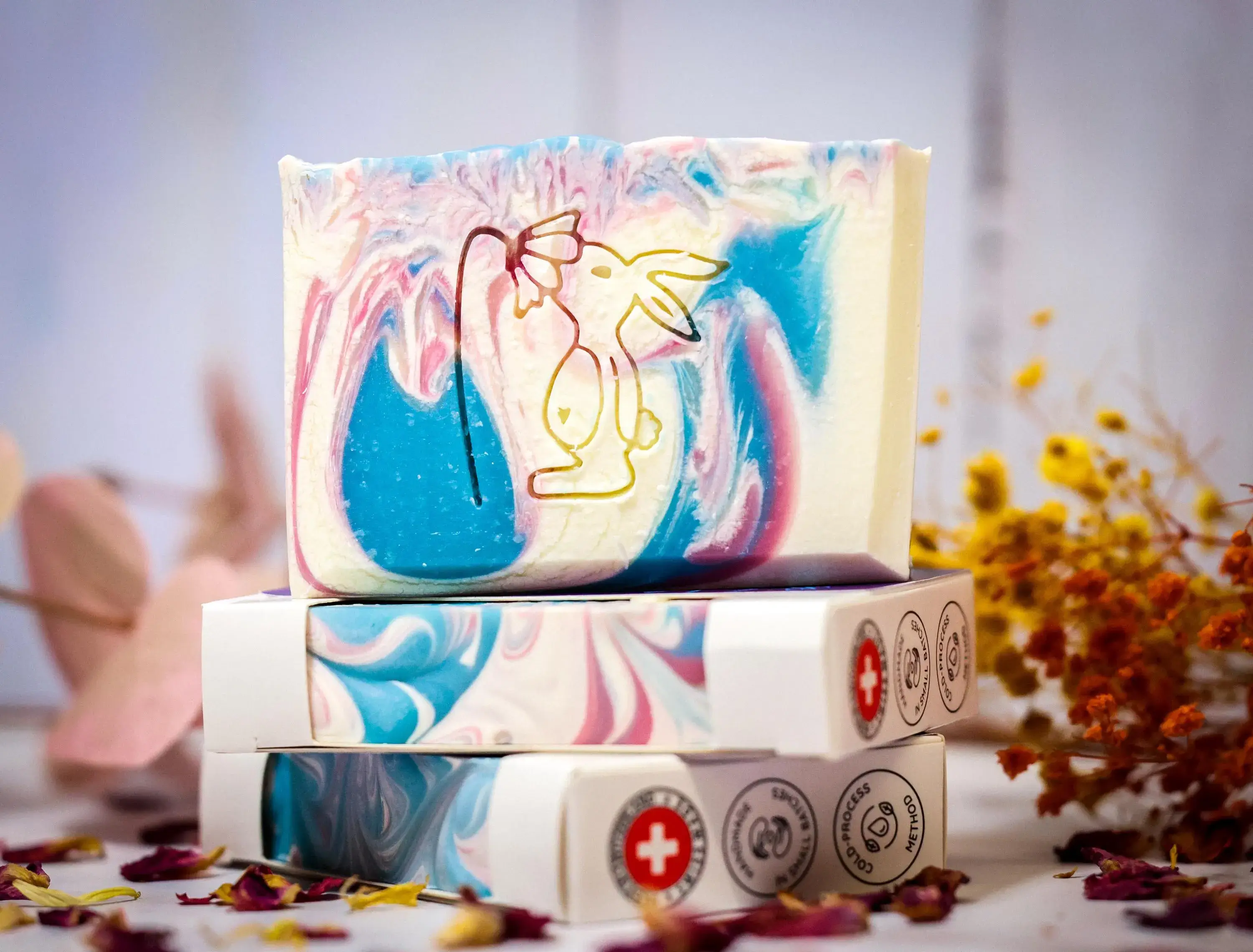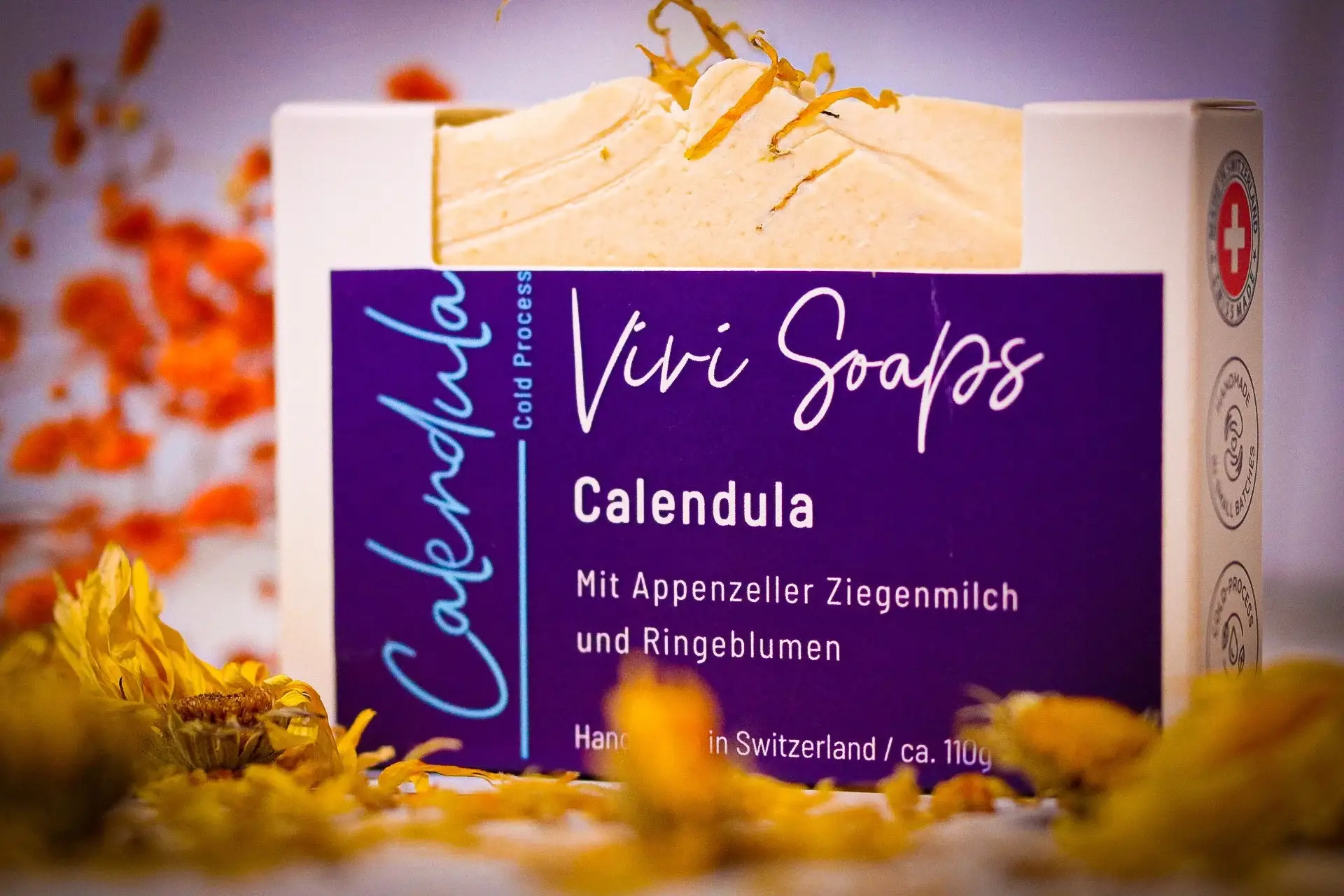 My unique recipes are full of a wonderful blend of vegetable butters and oils that give my soaps their luxurious foam and nourish and moisturize your skin. I only use plant-based additives such as pure essential oils, cosmetic dyes, and hand-picked organic herbs and fruit peel from my own garden and kitchen. I source the animal products (goat milk and honey) from an organic farmer in the Appenzell region. All my products are free from palm oil, harmful chemicals, toxins, or artificial preservative. All my products are handmade by me in very small batches in my studio in St. Gallen. My soap is cold process soap, which means I make the recipe from scratch with full control over all the ingredients. Each bar of soap is aged for 4 to 6 weeks. This ensures that all the water has evaporated and results in a harder soap bar that lasts longer
