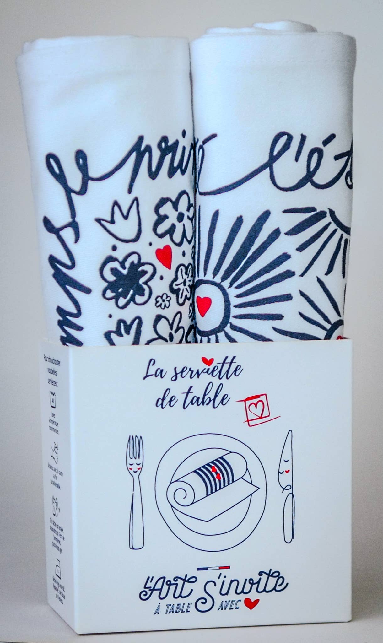 Made locally and inclusively in the north of France, we handcraft our napkins from carefully selected fabrics, sourced from end rolls, fabric scraps, or tablecloths from major linen houses! Therefore, our fabrics are not all identical, and our napkins are unique. We create timeless collections in collaboration with passionate illustrators and artists who lovingly contribute to the project.