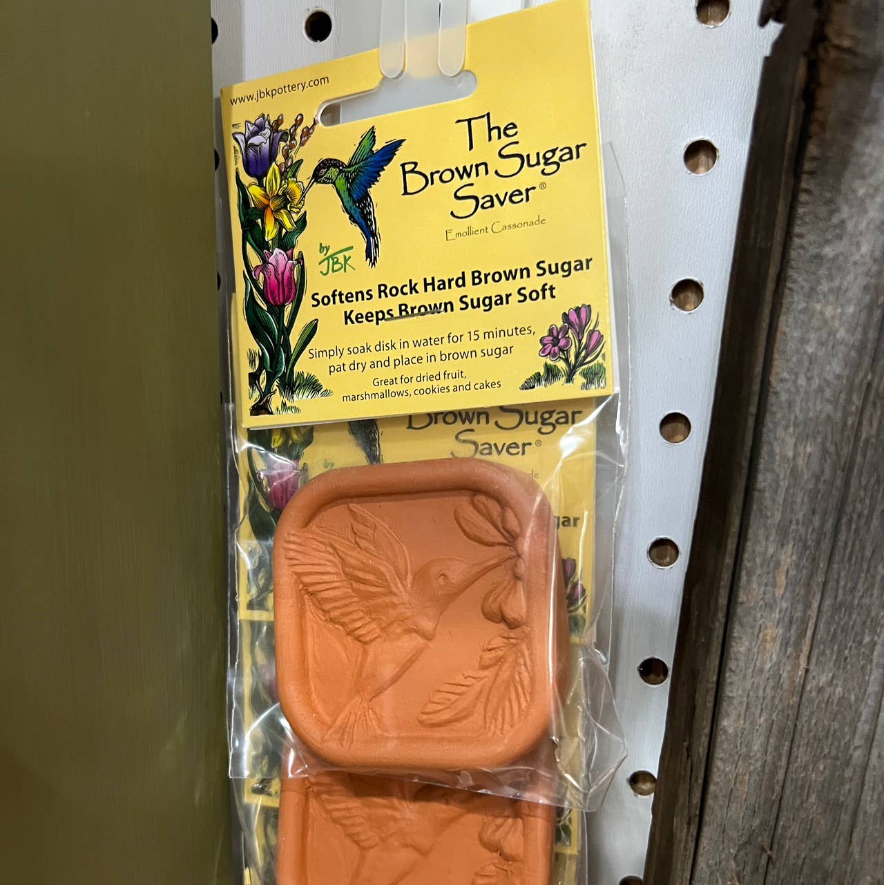 Brown Sugar Saver Clip Strip. Comes with 12 Brown Sugar Savers and a Clip Strip. About the Brown Sugar Saver: Soak your ceramic Brown Sugar Saver in water for 15 minutes, pat dry, and tuck it in the brown sugar. When kept in a sealed container, this will keep brown sugar soft for up to 3 months. When sugar begins to harden, re-soak, pat dry, and use again. Approx 2.3” in diameter and .4” thick Use after soaking to soften and maintain moisture in brown sugar, granulated sugar, sugar in the raw, turbinado sugar, and sugar substitutes, baked goods, cakes, cookies, marshmallows, even dried fruit. Or, use it dry without soaking to absorb moisture and keep spices, salt, crackers, pretzels and chips dry and crispy. If you already have rock hard brown sugar, just follow the same instructions above wait overnight and then re-hydrate as the rock hard brown sugar will have absorbed most if not all of the moisture.