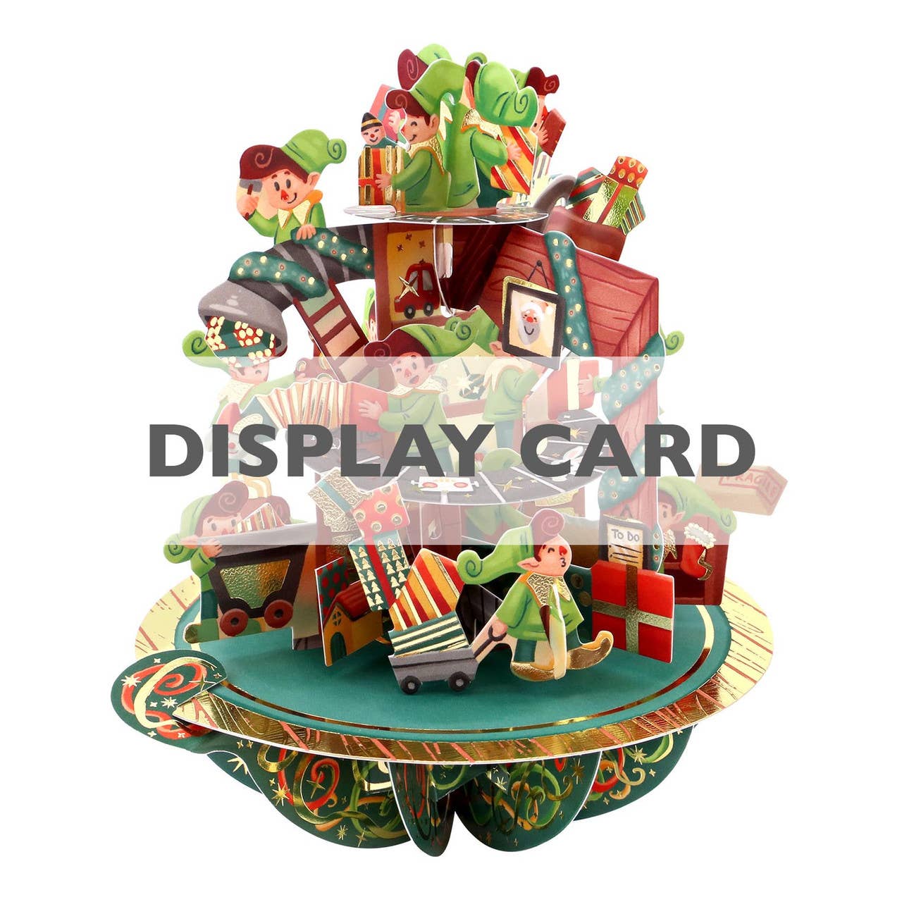 Santa's Workshop is in full swing! Featuring adorable elves, presents and more. A celebration of Christmas by Santoro, these seasons-greetings are like no other. World-renowned paper engineering combined with special printing effects make these Holiday cards stand out from the crowd. Each pop-up masterpiece portrays a joyful seasonal scene, perfect to send to loved ones to celebrate the merry occasion. Gifts and cards all-in-one, these cards double up as a marvellous Christmas ornaments, to be seen and loved by all year-on year. Folds flat into envelope (envelope included). DISPLAY CARD NOT INCLUDED. Don't forget to add these to your order. Approx Measurements: 18 x 17 x 14cm