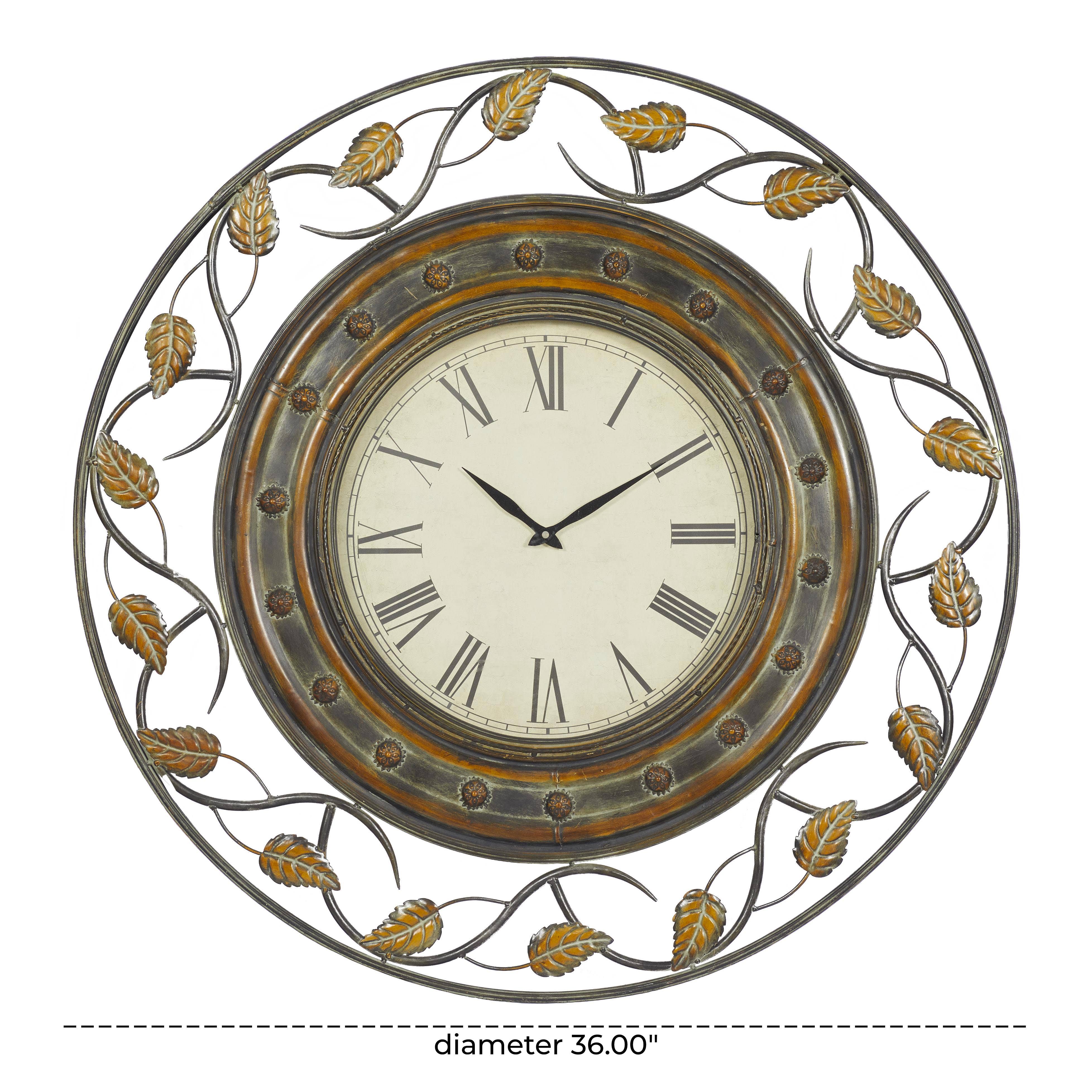 METAL WOOD WALL CLOCK 33"W, 33"H Perfect for your living room, office, or bedroom, this white wall clock for home adds both style and functionality. Requires 1 AA battery, not included. This item ships in 1 carton. Features Roman numerals for the hour markers. The clock mechanism runs silent. Can be hung vertically using the d-rings; nails and screws not included. Suitable for indoor use only. This item ships fully assembled in one piece. This is a single white colored kitchen clock. Farmhouse style. Showcases "EST 1863", "OLD TOWN CLOCKS", and "LONDON" typographies.