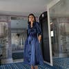 Bruma shirt dress in blue satin, ideal for a guest. Shirt collar detail and shirt dress effect body. Belt to adjust the fit. Buttoned. Slightly flared. - Model height: 1.70 Model size: XS - Perfect guest, Autumn, Winter, New Collection, Event, Wedding, Celebration