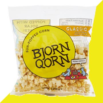 The BjornQorn Classic 30 pack of 1oz individual sized bags is perfect for a grab and go 'better-for-you' snack. It is popped in safflower oil and seasoned with nutritional yeast and salt. It is our best seller and customers regularly tell us they are addicted to it. The best snack. Crunchy, savory, umami. Simple ingredients. Non-GMO, Vegan, Gluten Free, Allergen Free, Kosher. If thats not enough here are some takes from Bon Appetit and Epicurious: //“BjornQorn is the only packaged popcorn worth buying.” -Bon Appetit// //“BjornQorn is the best popcorn ever.” -Epicurious// So give it a shot! 30 - 1 oz bags per case