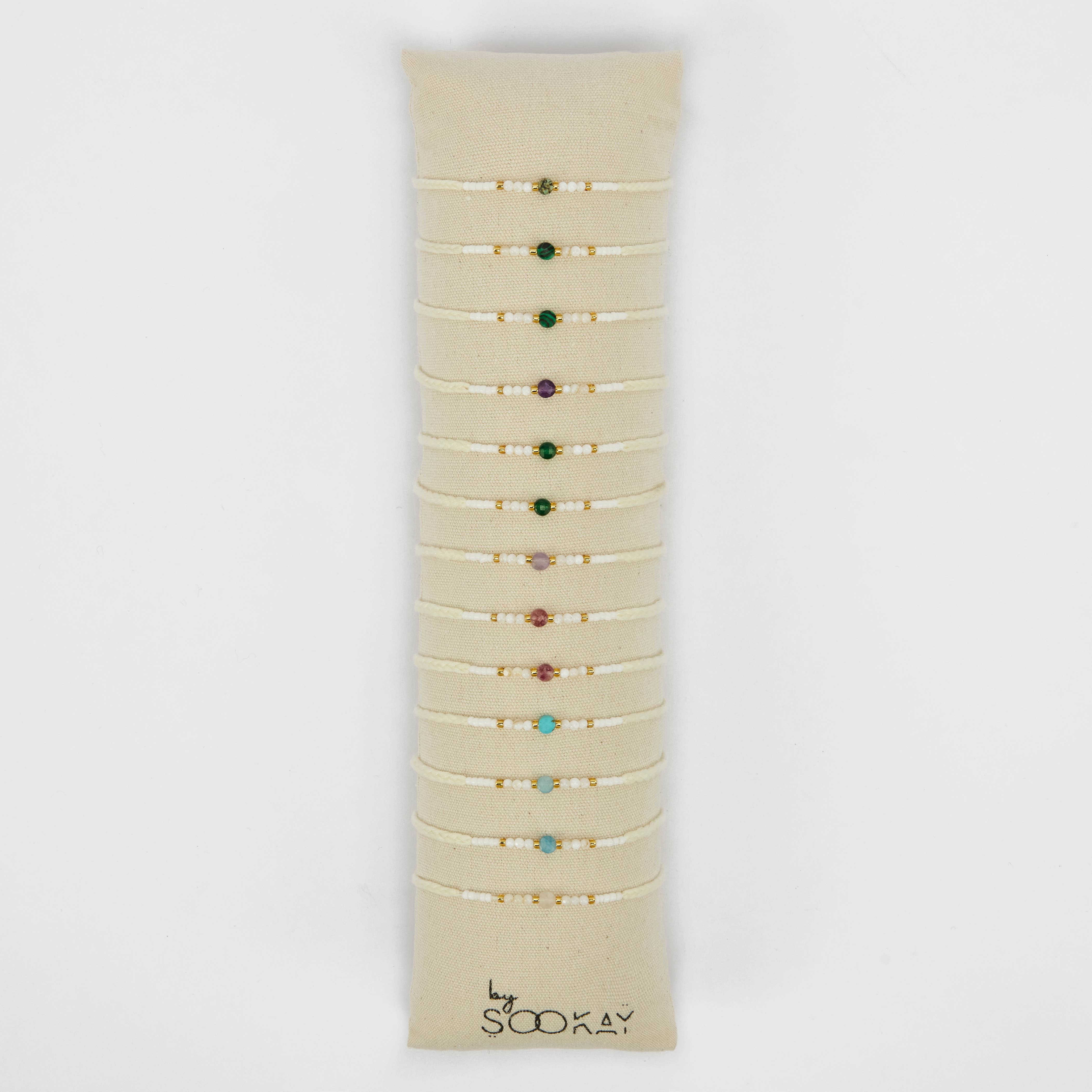 Luminous raw mother-of-pearl bracelets, dyed Heishi mother-of-pearl beads and Japanese beads, adjustable with a high-quality macramé sliding knot for comfort and adaptability. *Materials: stone, glass beads, high-quality nylon thread. *Sold in sets of 15 bracelets presented on an elegant cushion for immediate display in your store *Unit price €2, or €30 for the set