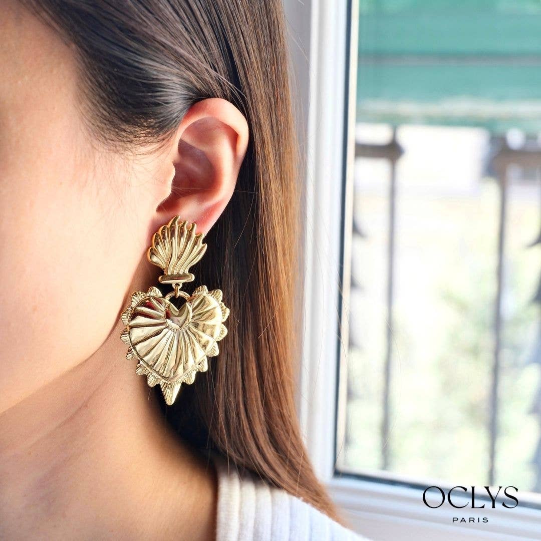 Adjustable gold stainless steel cuff bracelet, composed of a succession of sacred hearts finely linked together. Each textured motif reflects a symbolic and timeless spirit, forming a piece of jewelry that is both bold and refined. Thanks to its openwork design and luminous finish, this bracelet easily adapts to the wrist while adding a touch of chic and spiritual originality. Hypoallergenic — guaranteed nickel-free, lead-free, cadmium-free.