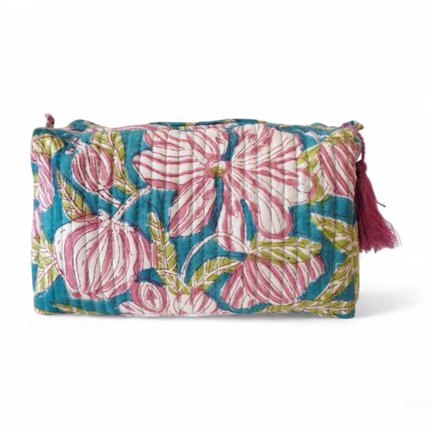 Cotton toilet bag, laminated interior with 4 small pockets. Very practical for storing all your little junk... Fabric printed with a wooden block in an artisanal way in India. Composition: Cotton, laminated interior Wash: Gently cold. Dimensions: Size S: 19x9x10cm Size M: 20x10x11.5cm Size L: 23 x 12x14cm
