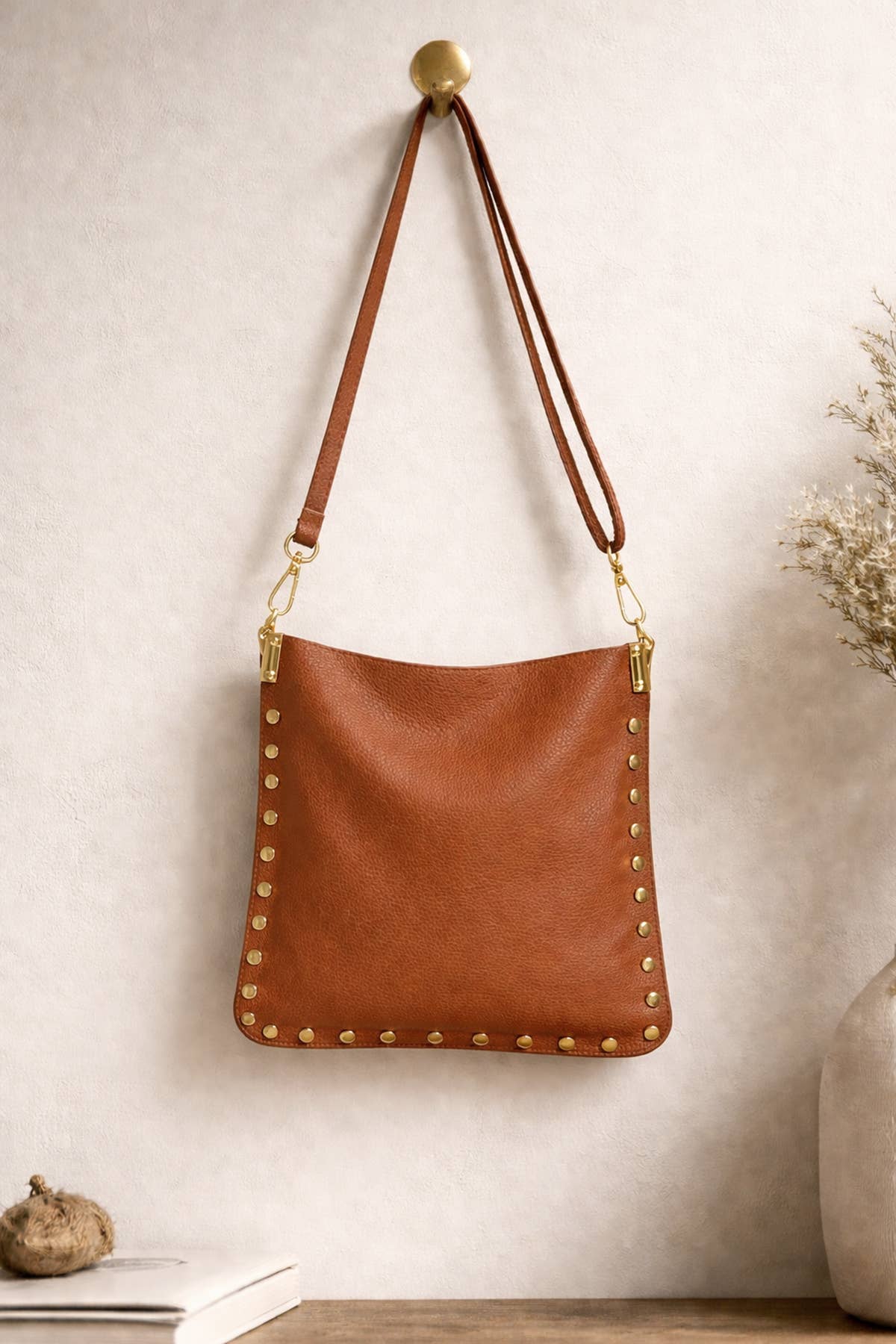 Bucket bag worn on the shoulder in split cowhide leather. Main zip closure. Removable gold chain shoulder strap. Gold studs on the front of the bag. Dimensions: 23x23x8 cm