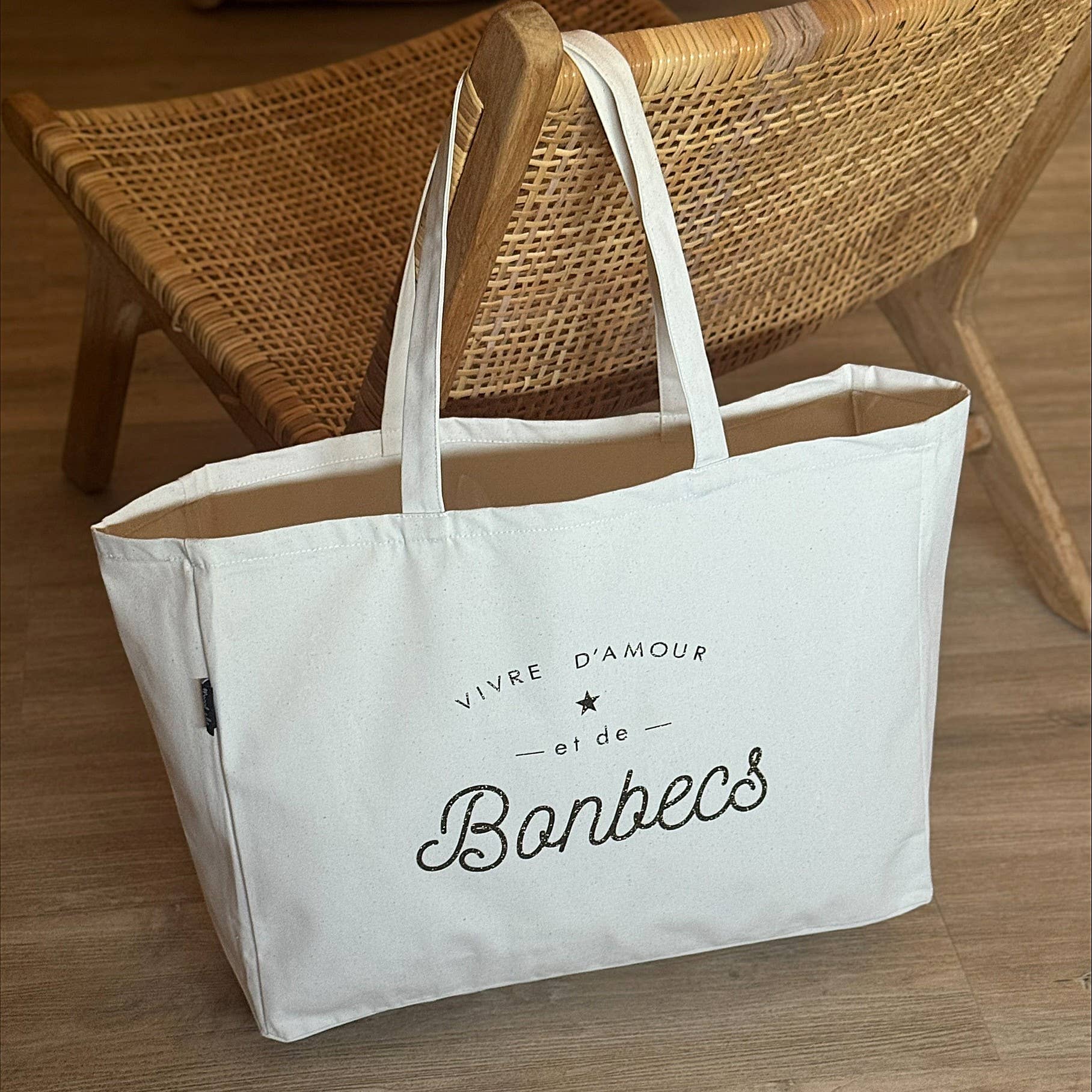 Maxi XXL tote bag, super sturdy for carrying all your joyful clutter! A real girl's bag for going to the beach, shopping... Made from a beautiful cotton canvas, 330 gr/m2 super resistant, woven in the Vosges. Composition: 100% cotton fabric woven in the Vosges Print: Glittery gold Dimensions: 52 x 38 with a 14 cm gusset Washing advice: Cold wash