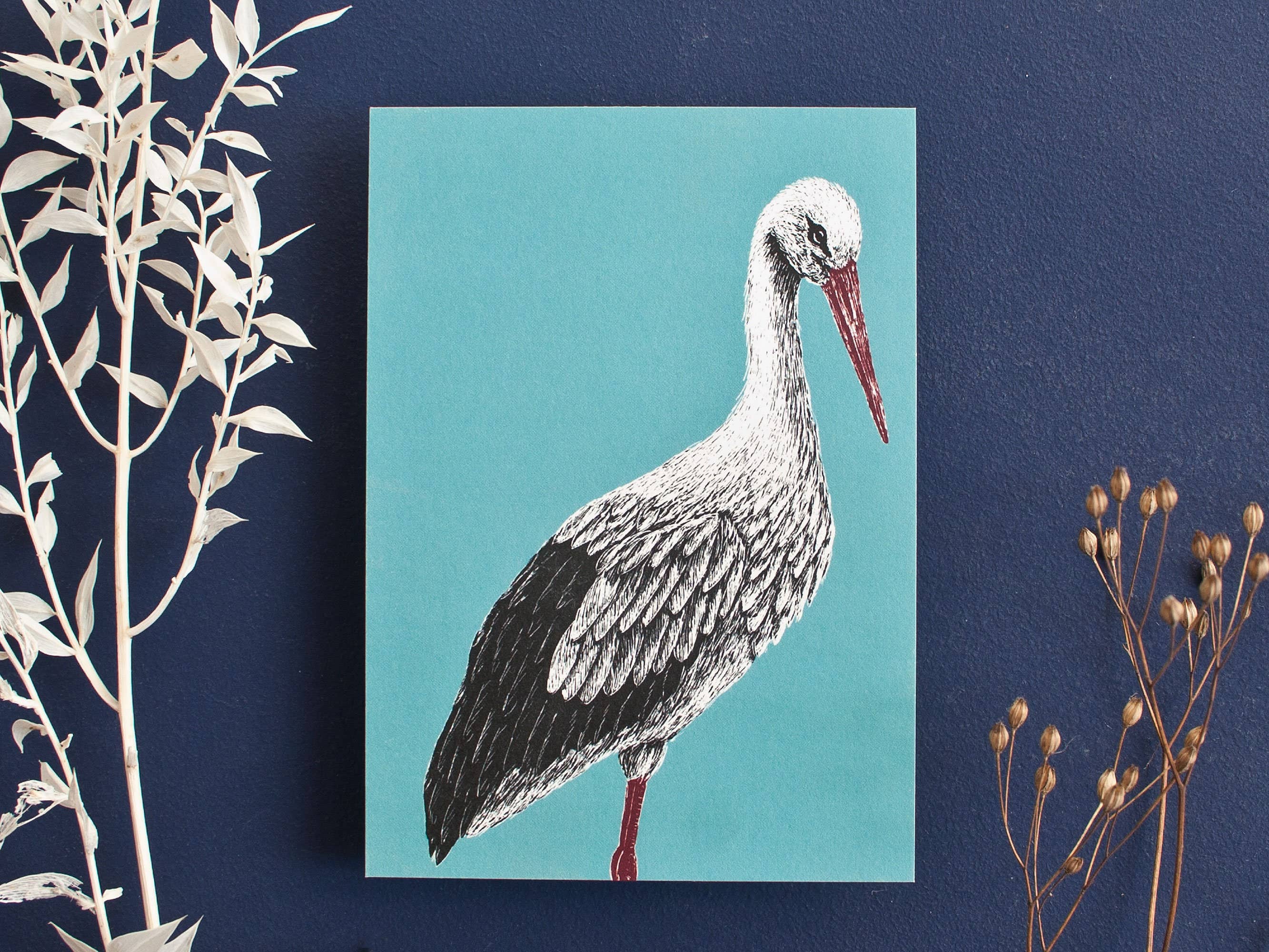 Postcard Stork A6 Send greetings to all bird and nature lovers with this stork card. The illustration for the bird was created on black scratchboard, then scanned and colored on the computer. The postcard in the format 10.5 x 14.8 cm (A6) was printed here in Leipzig on 350g warm white, FSC-certified natural paper. On the back, lines for the address field are provided along with a small illustration where the stamp goes.