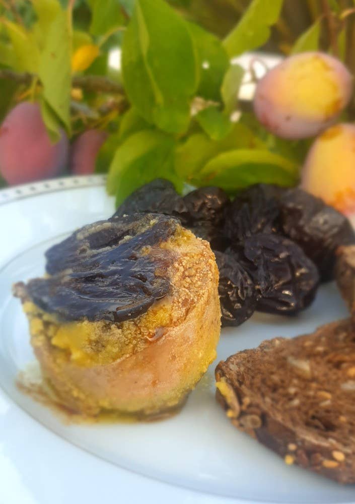 It is a duck breast that we open in half and in which we put whole duck foie gras. After putting it in a net to keep the ingredients together, we cook it in a broth flavored with Cognac that we let reduce. This all-duck mixture can be enjoyed cold as a starter. All you have to do is cut it into slices and serve it accompanied by its fine Cognac jelly.