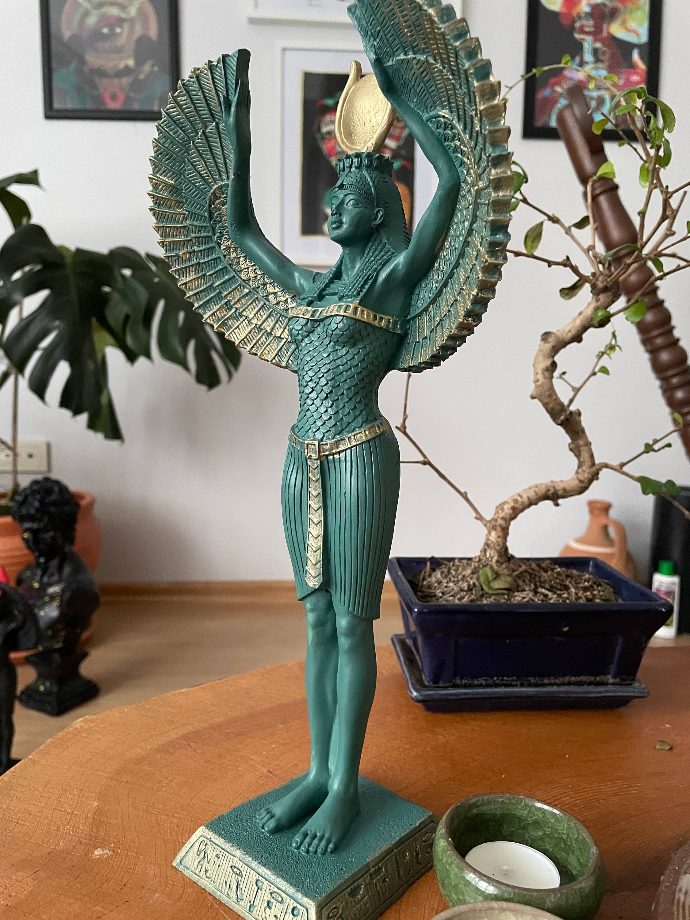 Handmade Egpytian god statue sculptures Home Decor Gold Height: 13 inches /34 cm Description Isis is a goddess in egyptian mythology. She was known as the goddess of the moon. As goddess of life and magic, ısis protected women and children, and healed the sick. Closely linked to the throne, she was one of the greatest goddesses of ancient egypt. This handmade bust statues offers perfect home decoration for the living room, bedroom, kitchen, bathroom, dining room, bar, sunroom, man cave, family room, garage, working space, cubicle office, study, library, nursery, cafe or restaurant. Shipping is all free and fast. You don't need to worry about this kind of issues. We are handling it for you. We are shipping your preference as fast as we can, in boxes wrapped by bubbly nylon bags to make sure it will reach you safely.