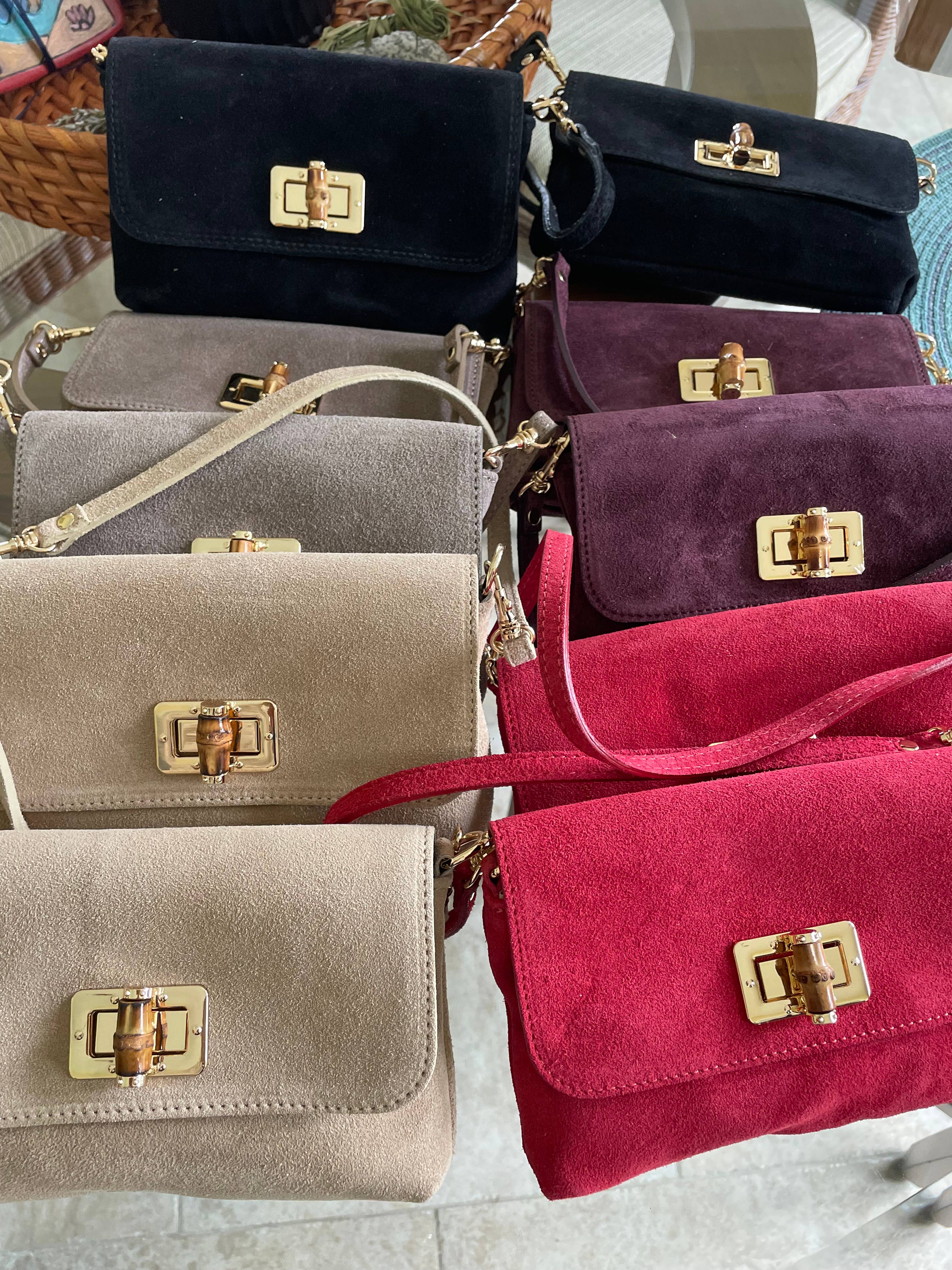 Suede genuine leather bag Made in Italy, small but versatile. Entirely handmade from high-quality Italian leather. • Double strap: one leather strap for hand carrying, and a chain strap for shoulder or crossbody wear. Bamboo closure. Perfectly fits a phone and essentials for evenings or events, but also for more casual and everyday looks. 👜 Measurements: Height 13cm / 5.12” Length 19cm / 7.48”