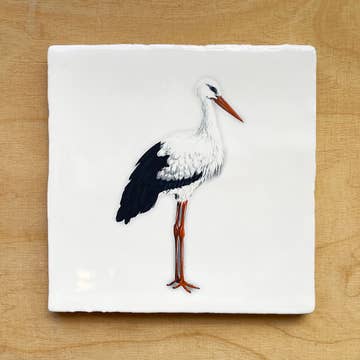 Vintage style tile with the illustration of the Stork by MYRTE. Create a collection of our crisp white tiles with your favourite birds, insects and animals to show your love for nature. Hanger included 13×13 cm / 5x5 inch Delivery time depends on stock Printed by hand in The Netherlands Print is fired into the glaze washable and durable.