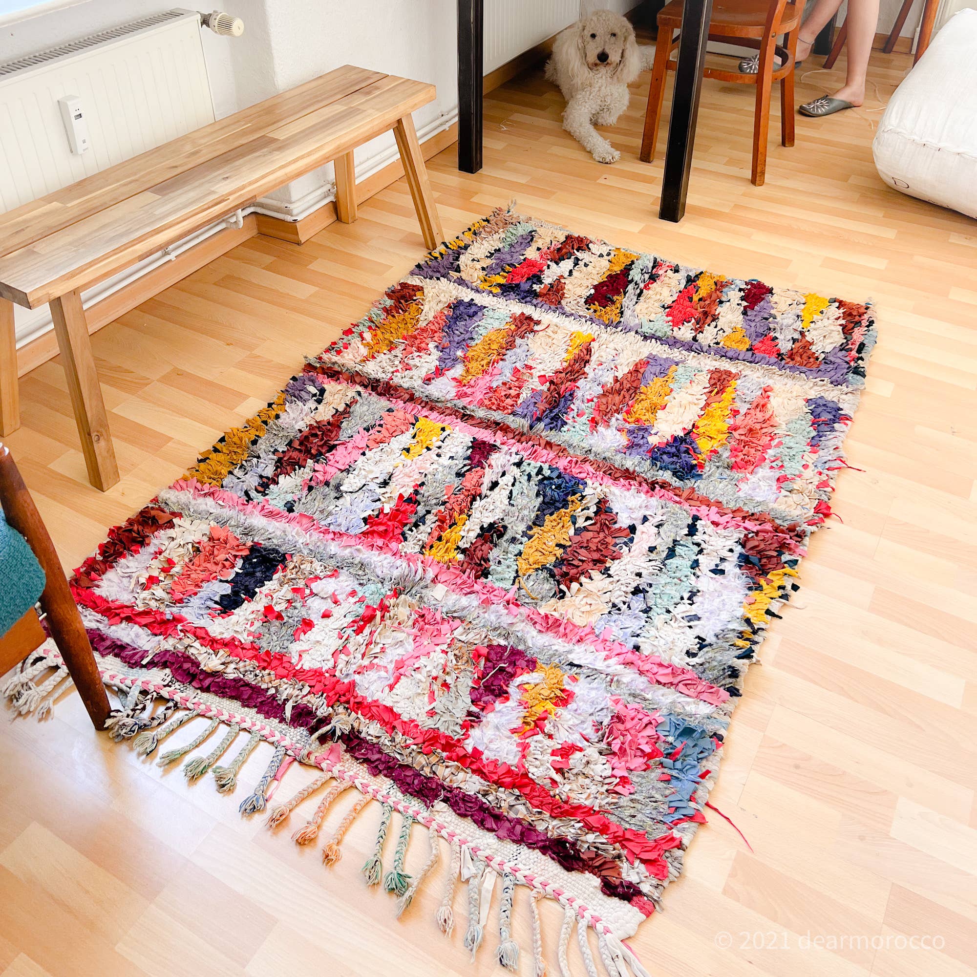 **SIZE** 112x66cm 0.7m2 +++++++++++++++++++++++++++++++++++++++++++++++++++++++++++++ **BOUCHEROUITE RAG RUG** Boucherouite is made by Berber women of Morocco. They keep used clothes of her family and sometimes buy used clothes or fabric from rural market to make rag rugs. Women who create it are usually farmer and make it for her own family with her idea and sensitivity. Each piece is unique, original. I collect Boucherouite rag rug for more than 10 years. I choose from lots of them and collect just what I really love. We repair and wash all of them before taking picture. +++++++++++5 good points of Boucherouite rag rug++++++++++++++++++++ 1: Upcycled 2: One-of-a-kind 3: Strong and heavy 4: Washable 5: Unique [Upcycled] Made of used clothes. [One of a kind] You can not find the same thing. Your Boucherouite rag rug is only one in the world. Delivery: from Marrakesh Morocco. We ship within 3 to 7 days.