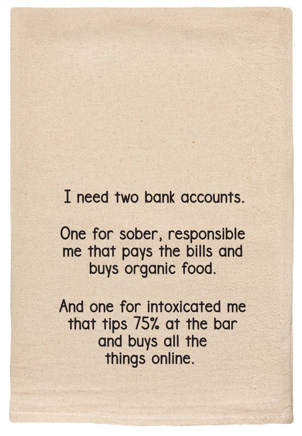 Our natural kitchen towels are sewn and printed by hand (by our all female team!) in Michigan from 100% unbleached cotton. They measure approximately 24" x 26" when opened up, and can be thrown in the washer and dryer. They're printed with an eco-friendly, water-based ink, that's good for the environment and soft to the touch! Our natural towels are more textured than our white towels and come in a folded stack, (not on hangers) great for throwing over a ladder rung! They make a great hostess gift with a bottle of wine, or a fun stocking stuffer or white elephant gift too! KEYWORDS: I need two bank accounts, one for sober, responsible me that pays the bills and buys organic food, And one for intoxicated me that tips 75% at the bar and buys all the things online, dieting, retail therapy, shopping addict, kitchen accessories, cooking, entertaining, bff gifts, funny tea towel,cleaning rag, funny sayings, tea towels, kitchen towels, made in Michigan, made in USA