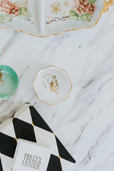 Like your Nana's dish, but better. At Wings Hawaii, we love breathing new life into gorgeous vintage dishware. We start with our original mermaid artwork, and fire it on as a permanent overglaze decal, creating a one-of-a-kind, upcycled treasure. This lovely vintage platter features a gold trim and a reclining mermaid design. Use on your holiday table, or to display your favorite Wings jewelry. Handmade with aloha in our Haiku, Maui studio. Materials: - Vintage China - Gold Luster Overglaze Decal Care instructions: Hand-wash gently with a sponge or soft cloth. Do not use in dishwashers or microwaves.