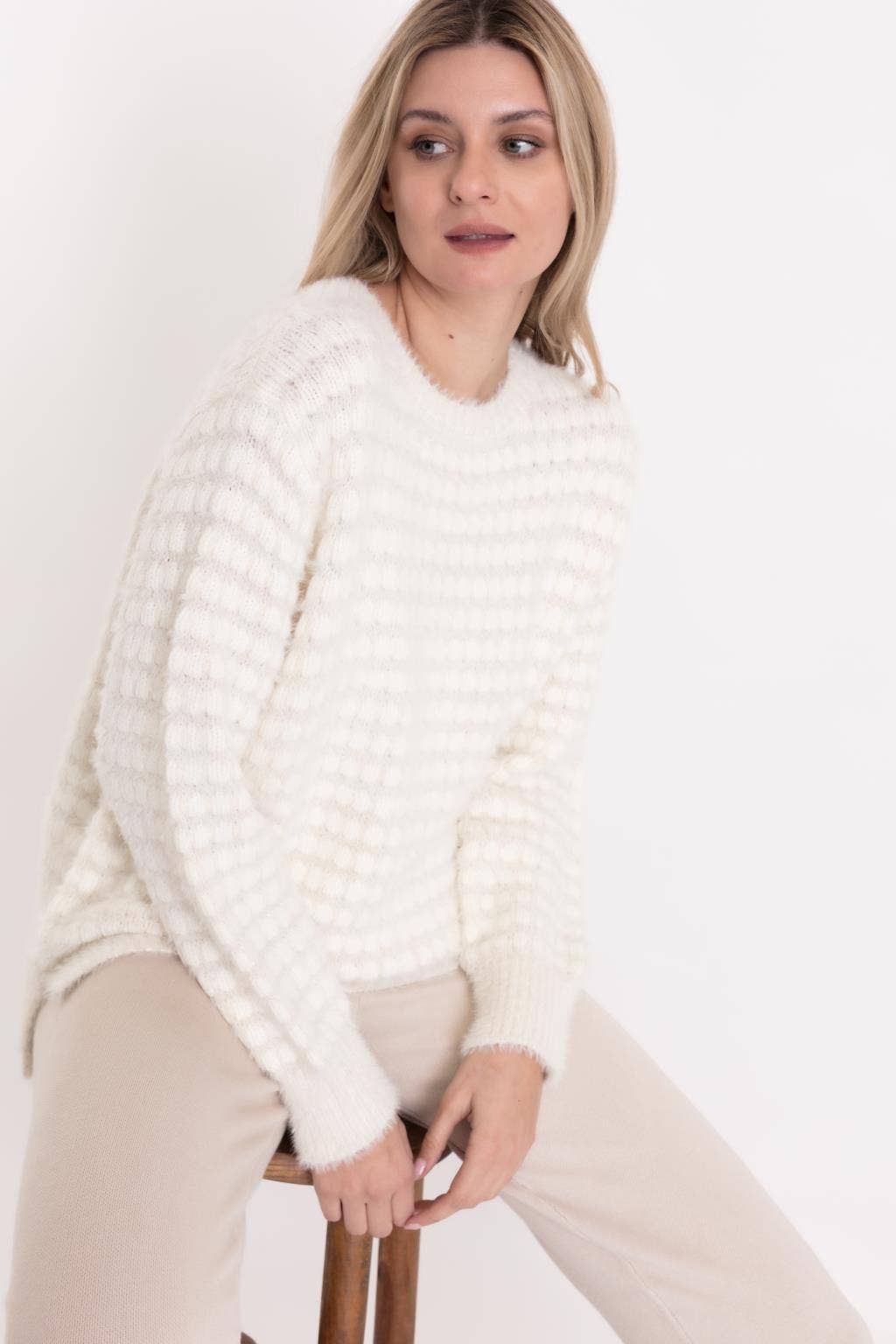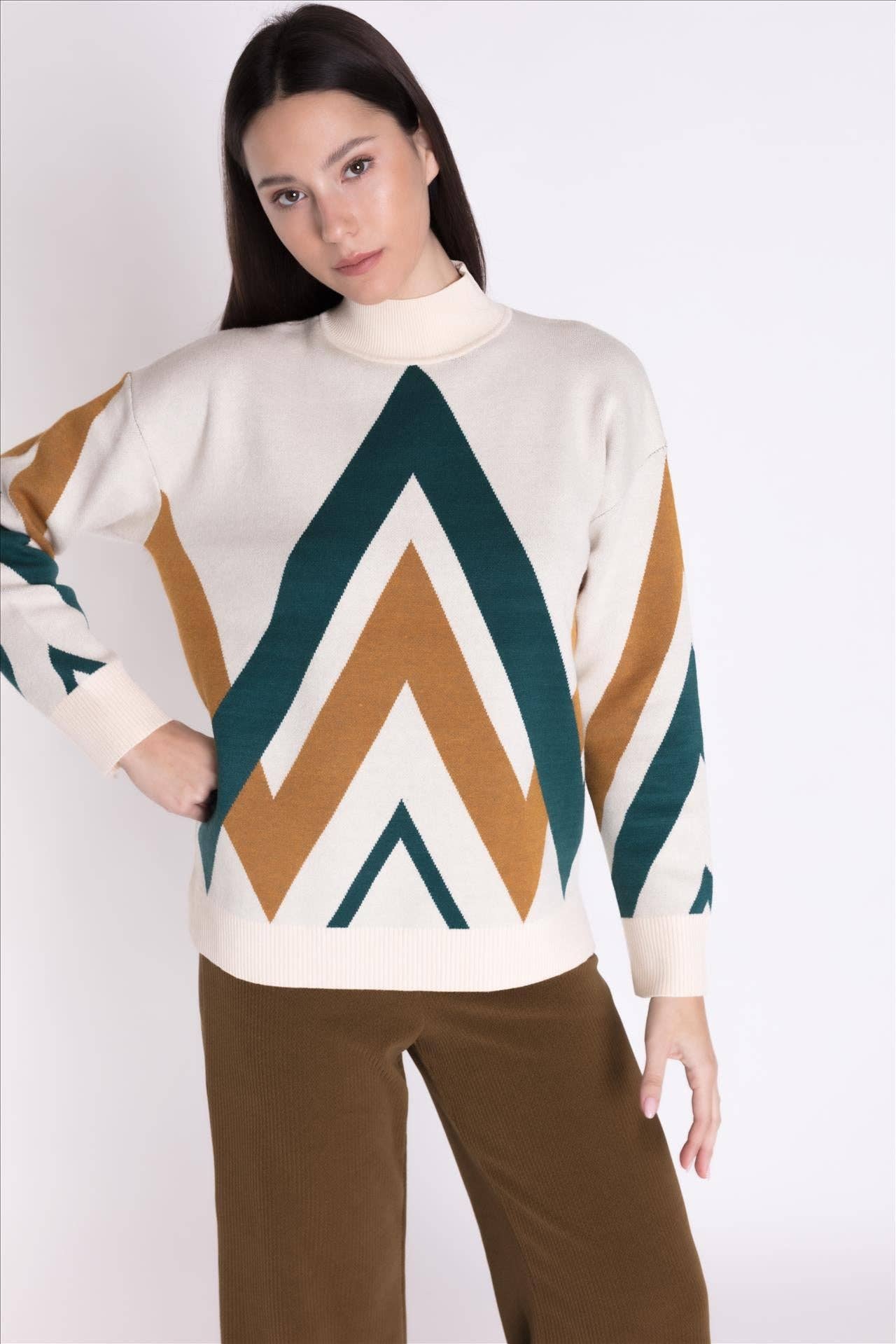 Soft knit sweater with a round neckline and dropped sleeves. Vertical pattern in earth tones.