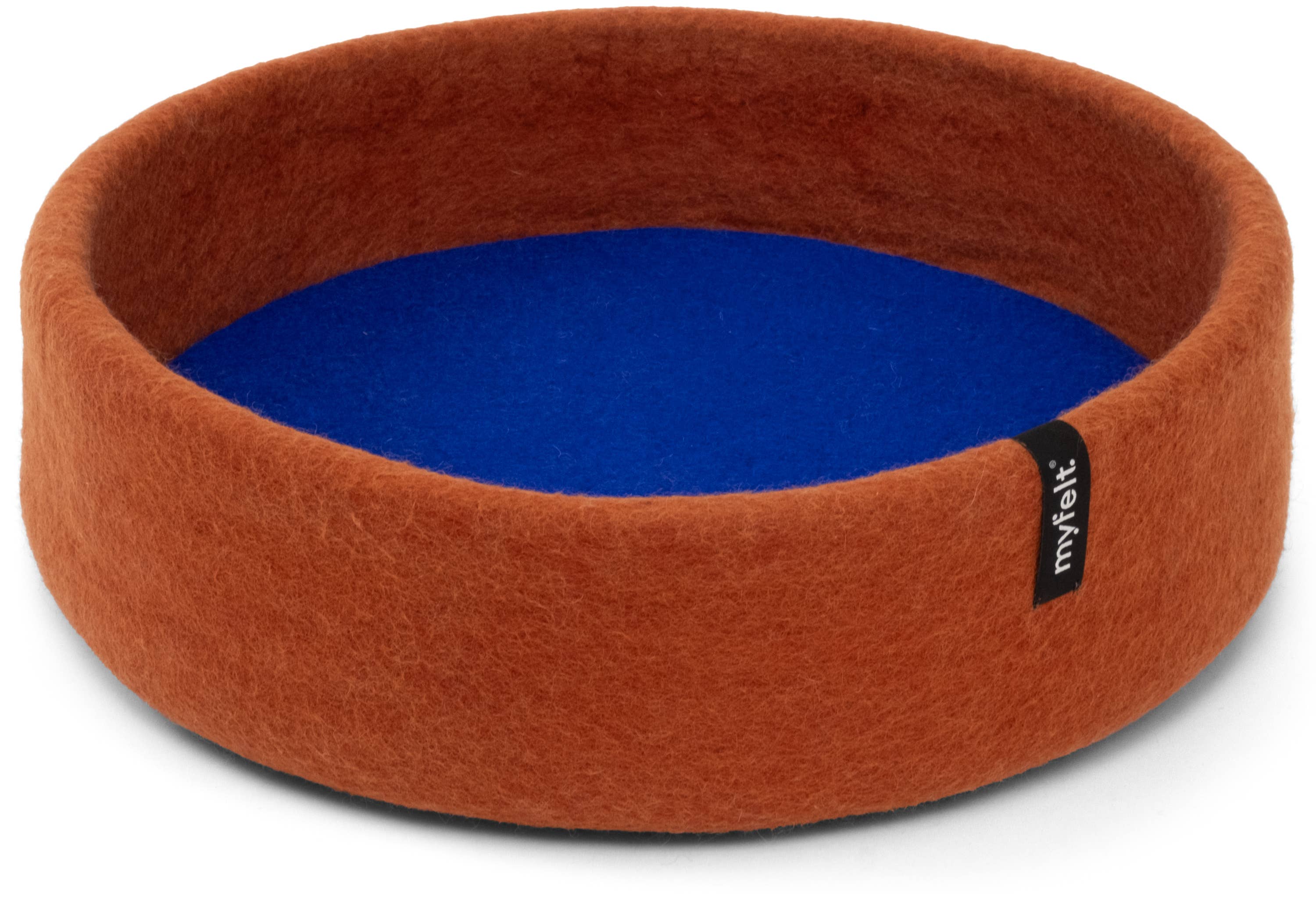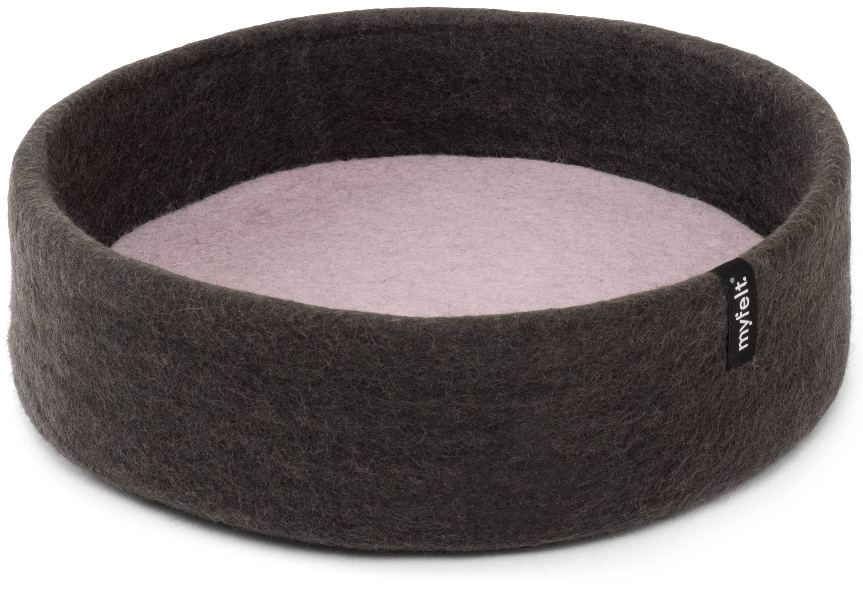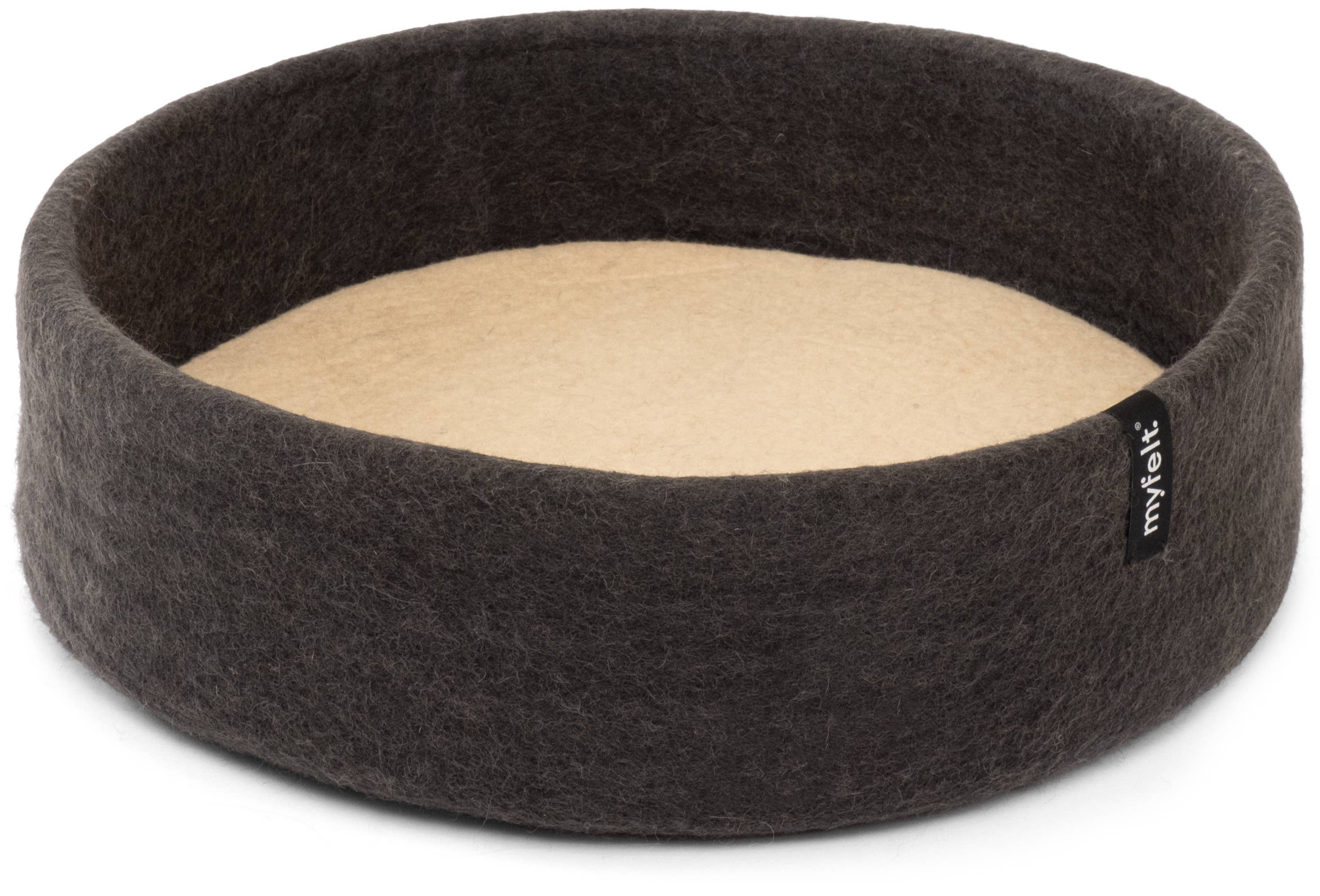 In the cat basket handcrafted from pure new wool, small and large tigers feel comfortable and secure. Available in a diameter of 40 cm, in three colors and six differently colored inlays, a variety of color combinations can be created. Thanks to the natural wool fat, the material is easy to care for, hygienic, and odor-neutral. Wool felt is antistatic and temperature-regulating. Thus, the basket is warm and cozy in winter and pleasantly cool in summer. An eye-catcher for your home. Each cat basket is made in manufactory quality. This way, the firmly felted material offers shape stability at the highest level. This ensures years of enjoyment – for the cat and the observer.