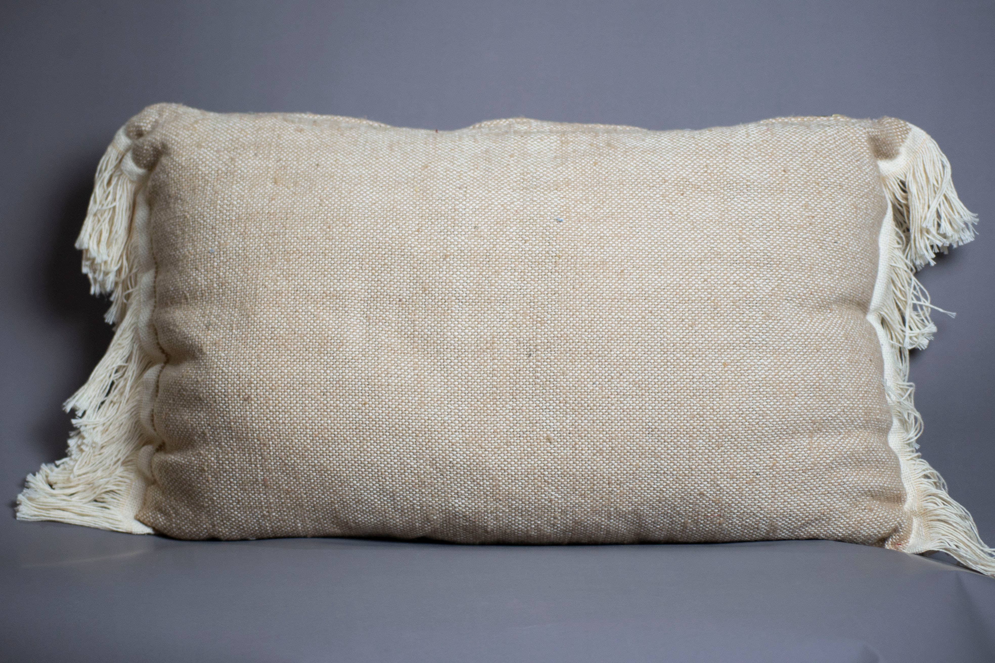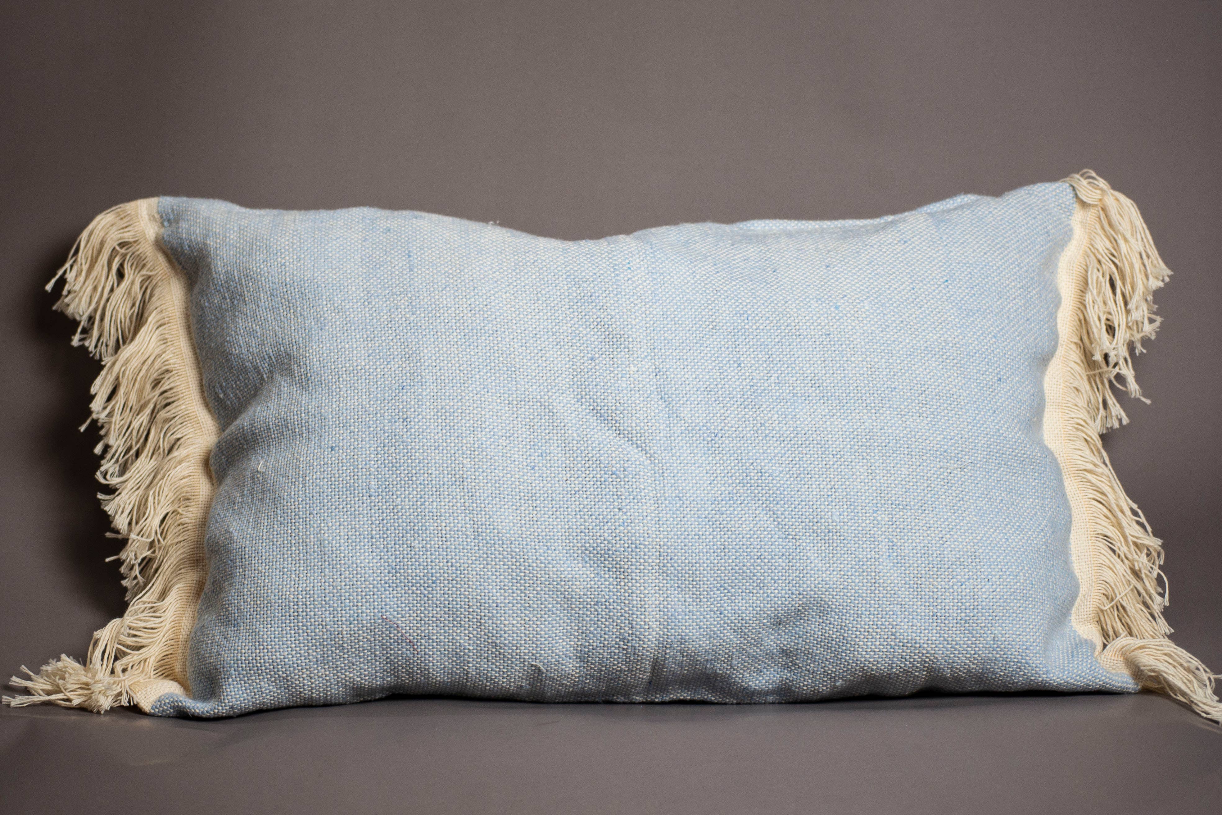Bring a fresh pop of color to your living space with this handmade Moroccan turquoise pillow. Woven with care from high-quality cotton, this pillow features a beautiful textured turquoise fabric, accented with soft cream fringes for a touch of bohemian charm. Perfect for sofas, beds, or reading nooks, this decorative pillow blends traditional Moroccan craftsmanship with a modern, relaxed style. Its vibrant yet calming color adds warmth and personality to any room. Details: Material: 100% Cotton Color: Turquoise with cream fringes Style: Moroccan / Boho chic Handmade in Morocco Pillow insert not included
