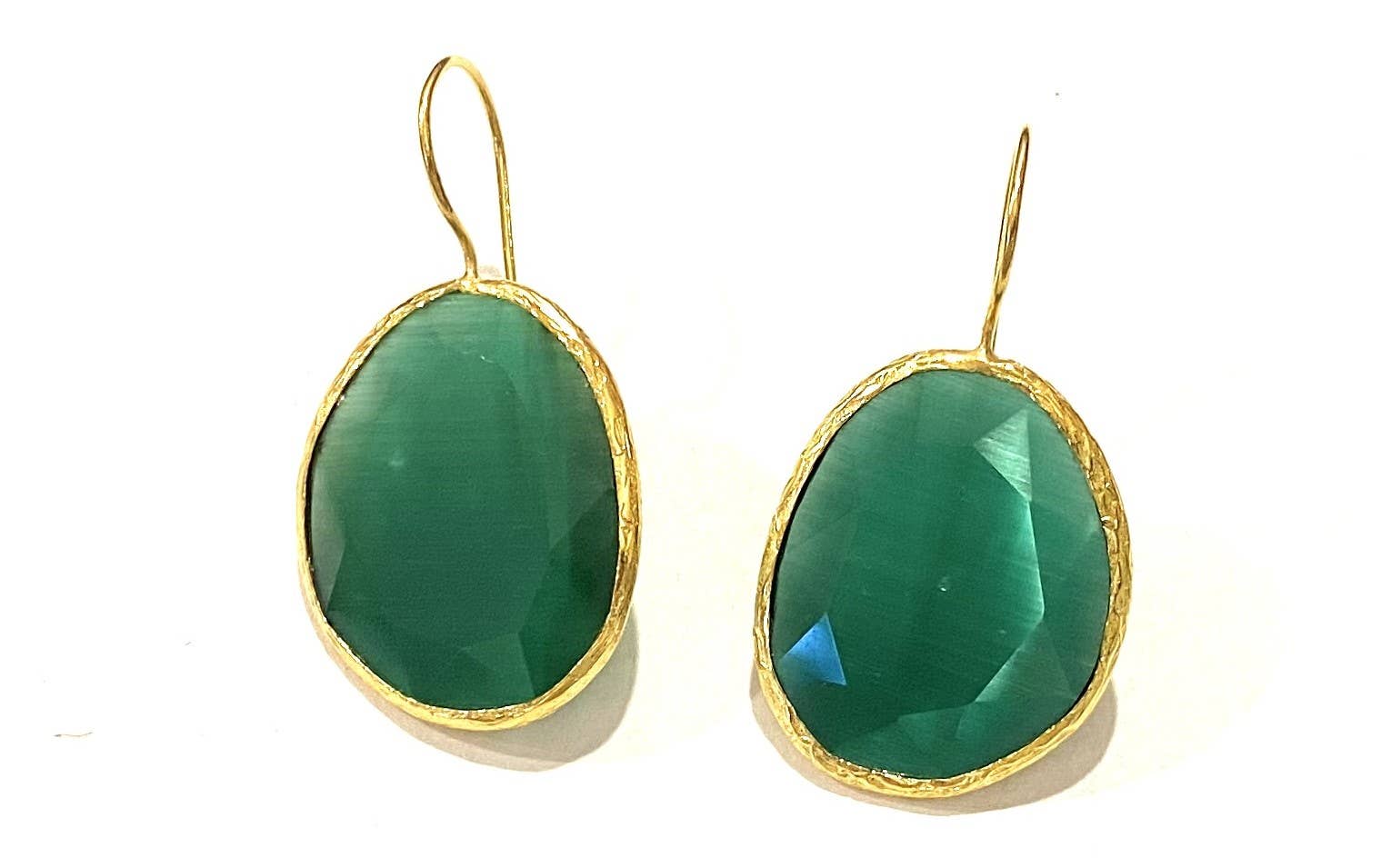 These earrings are made in collaboration with a small silversmith workshop in Istanbul by skilled craftsmen. These earrings are made of 22-carat gold-plated brass with green cat eye stone. These are synthetic gemstones.