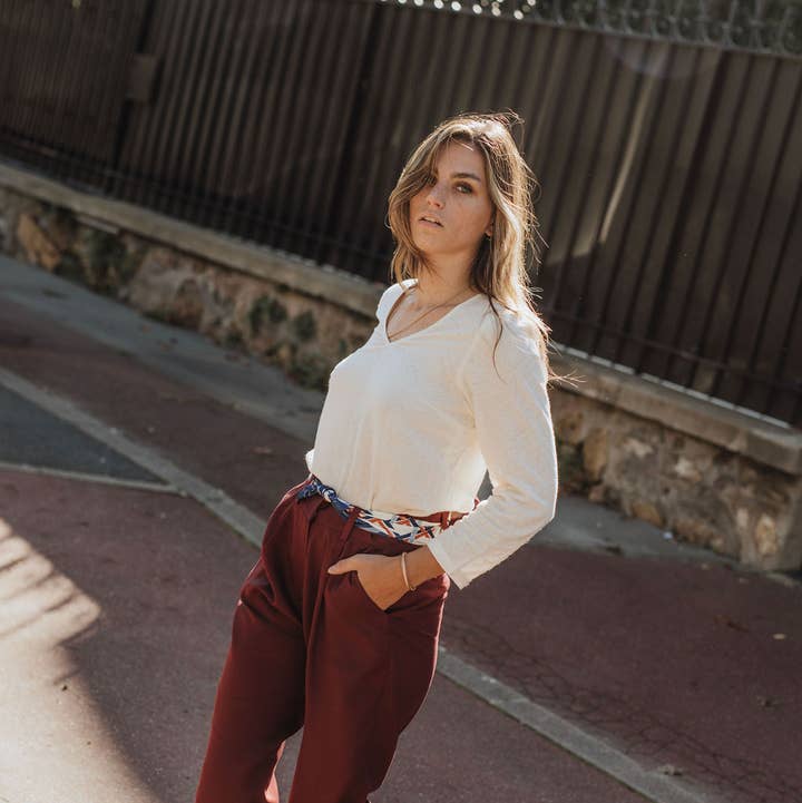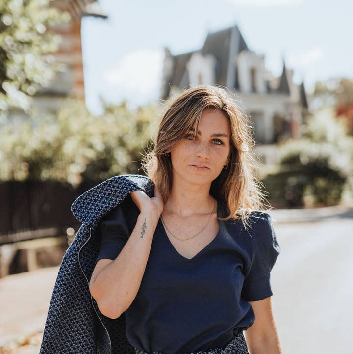 Discover the ecru Jackie blouse, a must-have for your responsible wardrobe. Made from soft, textured cotton, this midnight blue blouse with three-quarter sleeves combines comfort and sophistication. Perfect for any occasion, it fits perfectly with a professional or casual look, depending on your desires. Long sleeve blouse Textured material Straight cut 100% GOTS organic cotton Subtle V-neckline Made in France Sizes: 34 to 42 Available in midnight blue color