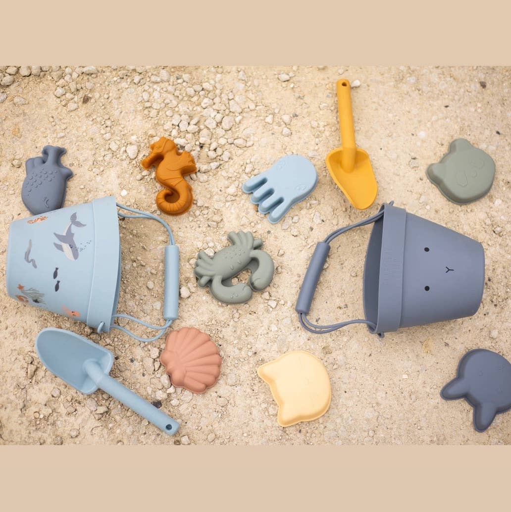 Warmer days are finally here which gets us excited for the plenty of beach days ahead and days spent outside playing in the sand pit or pool! The new silicone beach toy sets will be the perfect summer time toy for the beach or home. Includes: 1 x bucket with handle, 1 x spade, 4 x beach moulds for sad or mud The spade and the moulds all fit inside the bucket for easy storage. These sets are sure to provide your children plenty of entertainment and fun, meanwhile developing hand-eye coordination and motor skills. Made from 100% silicone, the beach sets are super flexible and durable. Silicone is also safe for your little one – it is BPA and Phthalates free. Each set is packaged in eco-friendly reusable cotton net bags with a drawstring. Perfect for storage, and keeping your set together at the beach.