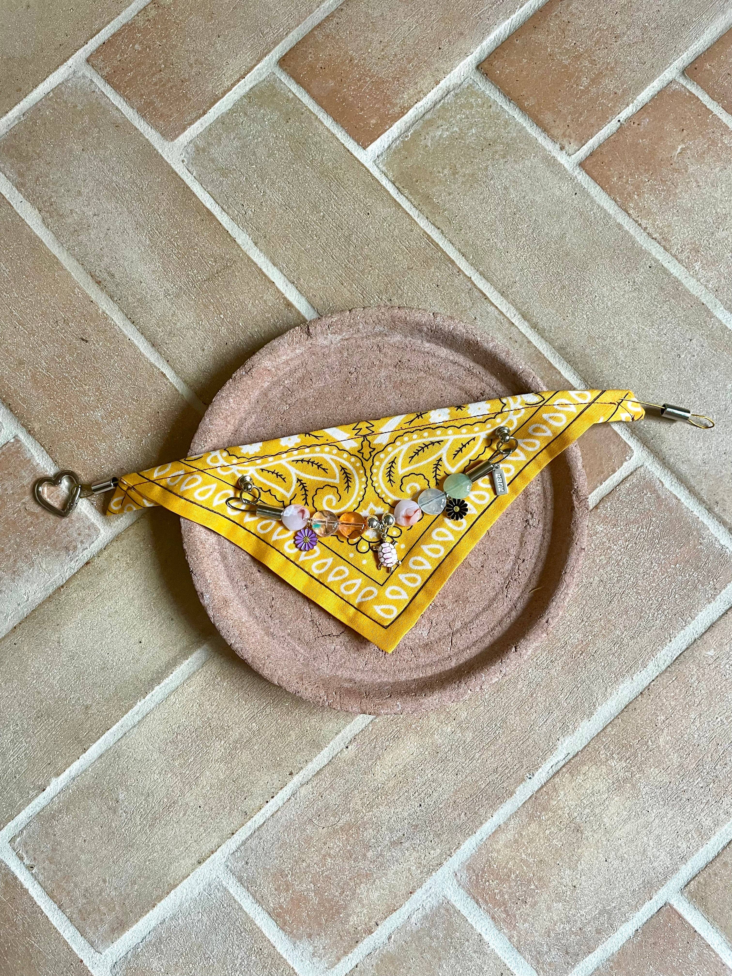Assert your companion's unique style with the Red Mustang jewel bandana, a chic and bold accessory inspired by the Wild West. Made from a genuine red paisley-patterned bandana scarf, it is adorned with a delicate chain set with pearls, golden charms, and sun and horseshoe pendants (for good luck!), for a bohemian and elegant look. Designed for dogs and cats with character, this bandana is easily fastened with its golden carabiner. Each piece is carefully handcrafted for a refined and durable finish. ✨ Product details: • Red bandana fabric • Decorative chain with pearl beads, medals, and golden charms • Fastening with golden carabiner and steel wire, very strong • Custom-made • Handmade in limited series 💡 Ideal for a special occasion, a photo shoot, or simply to enhance your pet's daily life with style.