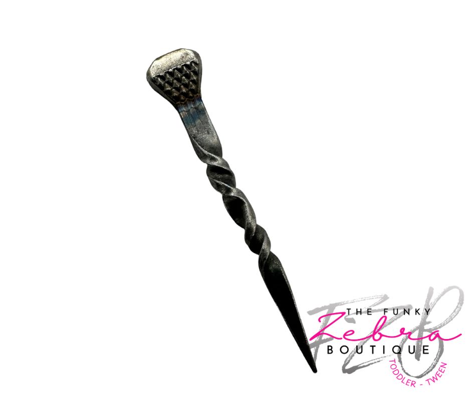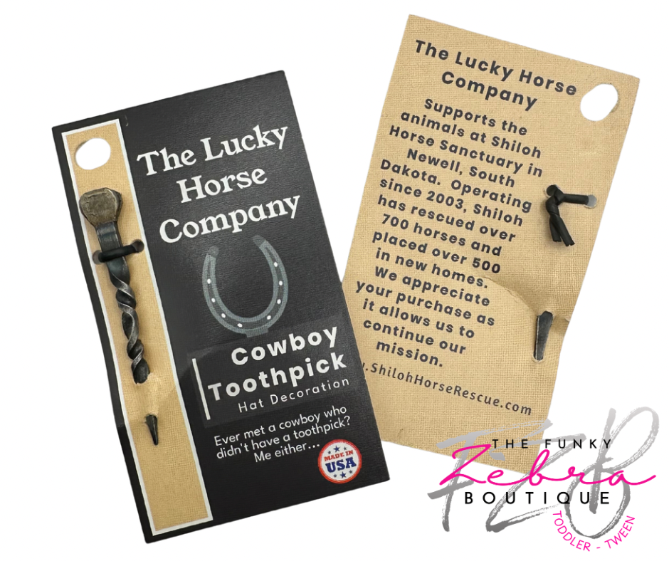 Cowboy and Cowgirl Cool! A Cowboy Toothpick is a unique hat decoration crafted from a twisted horseshoe nail. This small, rustic accessory is bent into a distinctive spiral shape, giving it a rugged yet stylish look. Typically worn tucked into the hat band of a cowboy hat, it adds a touch of western flair and individuality, reflecting the wearer's connection to cowboy culture and craftmanship. Each comes with a backing card for easy hanging. Purchase in sets of 12.