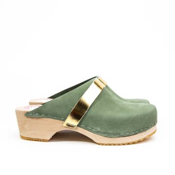 Moss green classic clog in nubuck leather with gold strap. Wooden sole, 4,5 cm heels. Handmade in Sweden. The shoe runs slightly large in size. If choosing between two sizes, pick the smaller! Marks on the wooden sole that might appear with use can easily be removed with a fine sand paper. Do you have questions or need additional information? Please contact us on sofie@liliandlala.com.