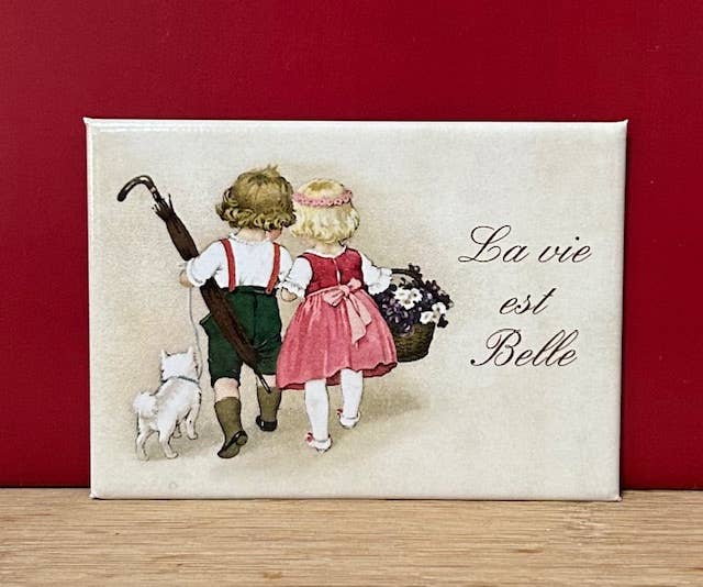 Rigid magnet to display on the fridge. Beautiful vintage illustration with the message "Only happiness".