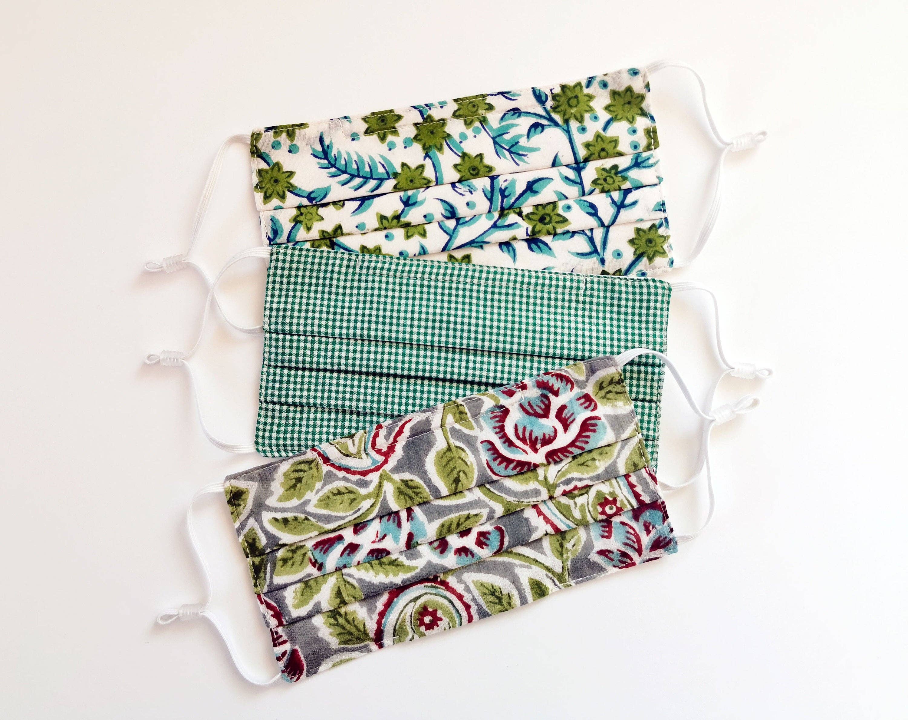 Product Name: Indian Face Masks, Set of 3, Pleated With A Filter Pocket, Nose Wire and Adjustable Ear Loops Having to wear a face mask during the summer has just been upgraded, these floral fashion face masks are here to make you smile. The perfect summer face mask since it is breathable and feature a pocket for filters if needed. Fashion Fabric Face Mask Features: • Standard adult size: 7 x 4 Inches (18 x 10 cm) • 2 layers of 100% cotton floral fabric • This set contains 3 colors: pink, blue and teal • Comes in a ready to gift eco-friendly drawstring pouch, made of leftover fabric • Reusable, washable and breathable ideal for the summer ahead • Head support: elastic bands with adjustable ear loops • Set of 3, with a filter pocket and nose wire DISCLAIMER This face mask is not meant to replace any surgical style mask and is not manufactured to meet any 3rd party standards or specifications.