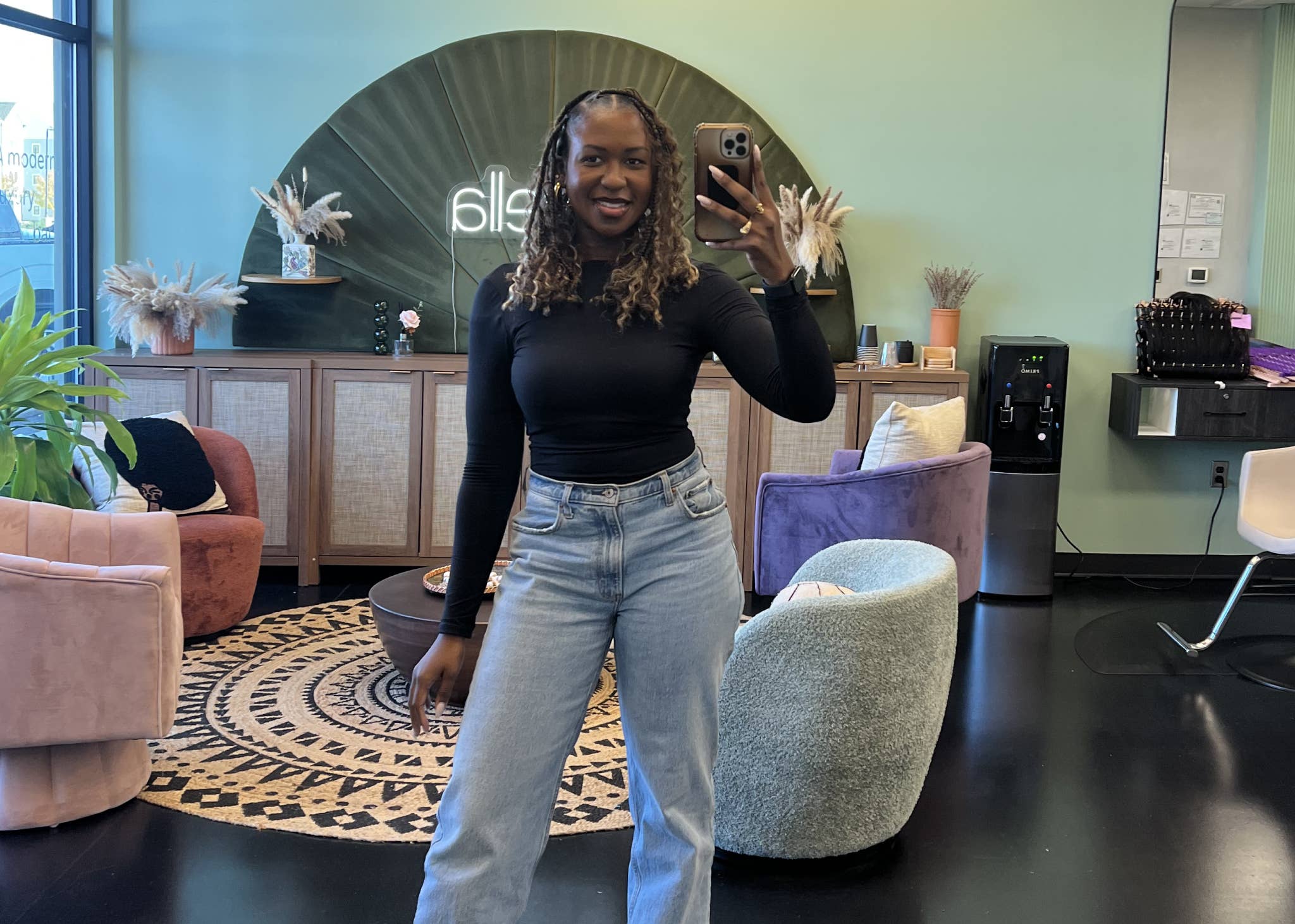 Le nouveau salon à Charlotte dispose également d’un grand miroir où les clients satisfaits s’arrêtent souvent pour prendre un selfie et immortaliser leurs nouvelles tresses. « Je me souviens que lors de la conception de l’espace, notre designer nous répétait : nous avons besoin de ce miroir, c’est un miroir gigantesque sublime, [et tant de] clients y prennent des photos », évoque Brooke. « C’est la preuve que nous souhaitons que nos clients se sentent pris en compte, dès leur arrivée. Dès qu’ils entrent et lorsqu’ils ressortent, ils se regardent littéralement, et je pense que c’est une jolie illustration de ce que nous construisons. »