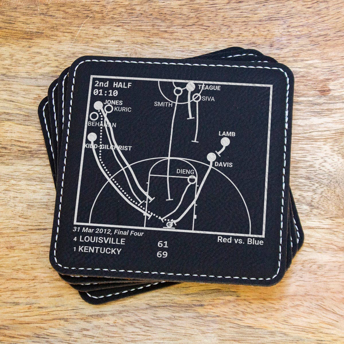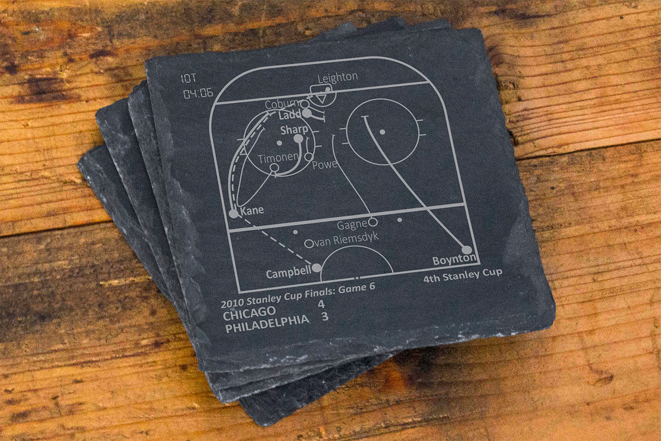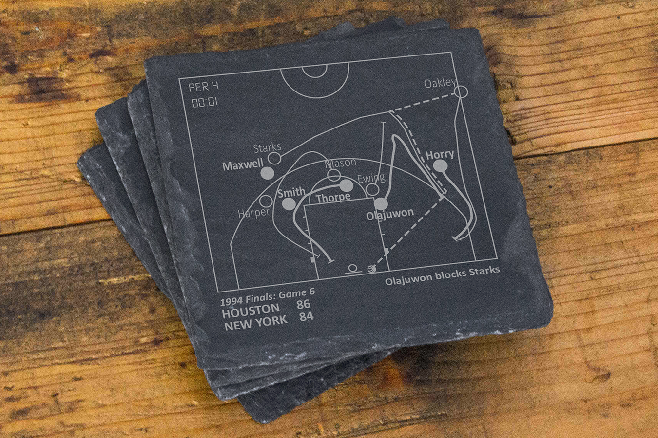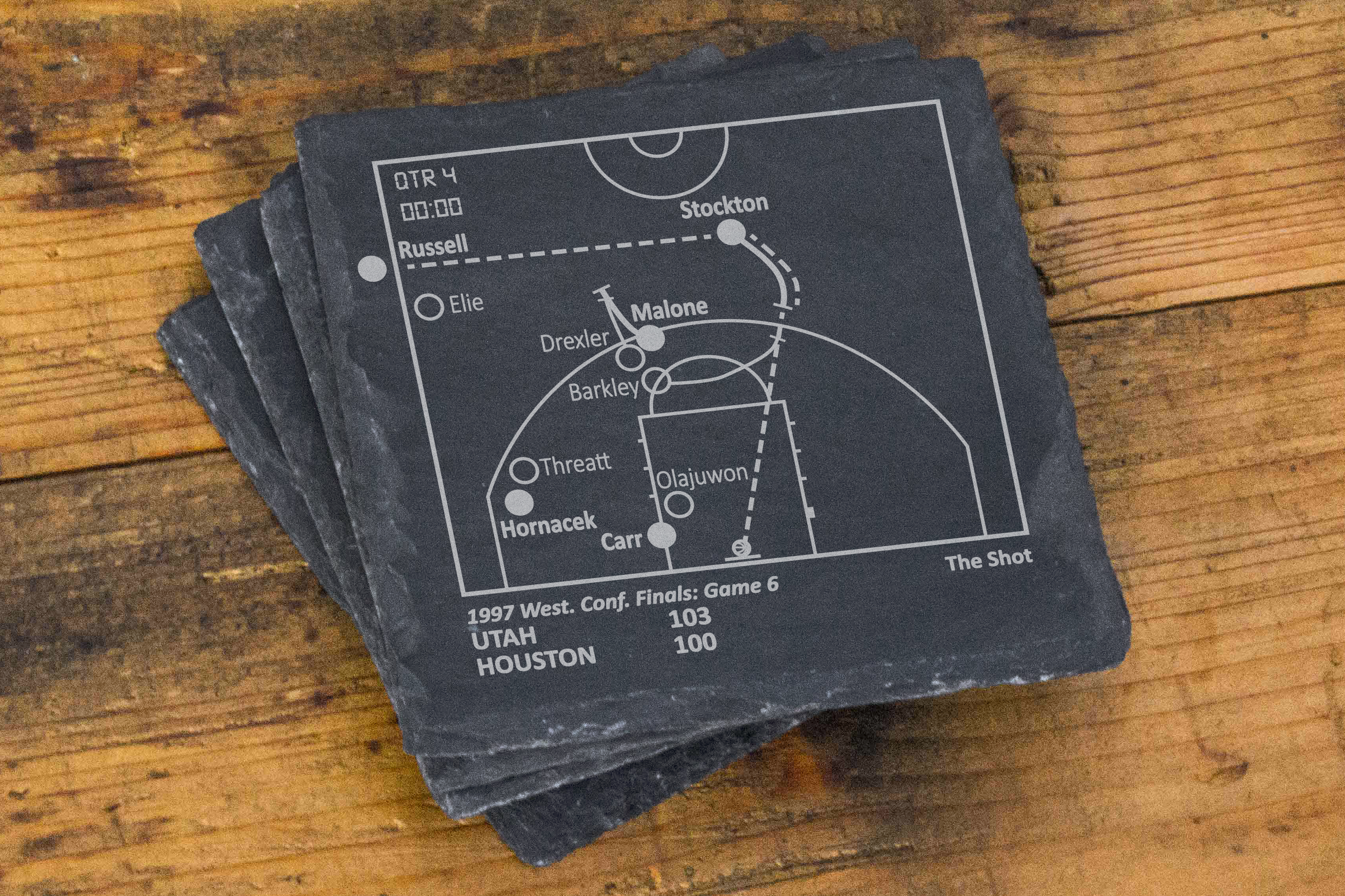 En tant que fans de sport, nous avons tous nos pièces préférées. Ces pièces concernent autant nous, les fans, que les équipes et les joueurs. Nous nous souviendrons toujours de ce que ces moments signifient pour nous. Chacun de nos produits raconte une histoire, que vous pouvez partager avec vos invités ou revivre en attendant le début d'un match. Cette entreprise a commencé avec un ensemble de dessous de verre en ardoise qui était un cadeau pour le 30e anniversaire de mon frère. Avec lui à 3000 miles, nous n'avons pas souvent l'occasion de regarder des matchs ensemble, mais le sport a toujours été un lien fort entre nous. J'ai fait des recherches sur les moments les plus importants de l'histoire de son équipe et j'ai schématisé les pièces pour qu'il puisse les revivre chaque fois qu'il s'asseyait à sa table basse. Avec plus de 14 000 avis cinq étoiles... nous sommes devenus une marque que les clients adorent et en qui ils ont confiance. **REMARQUE : Aucun joueur sportif, aucune équipe, aucune ligue ou aucune équipe des séries éliminatoires n'est affilié à Playbook Products™ ou n'est à l'origine de ces produits, n'en est responsable ou n'a approuvé, sponsorisé ou autorisé ces produits. **