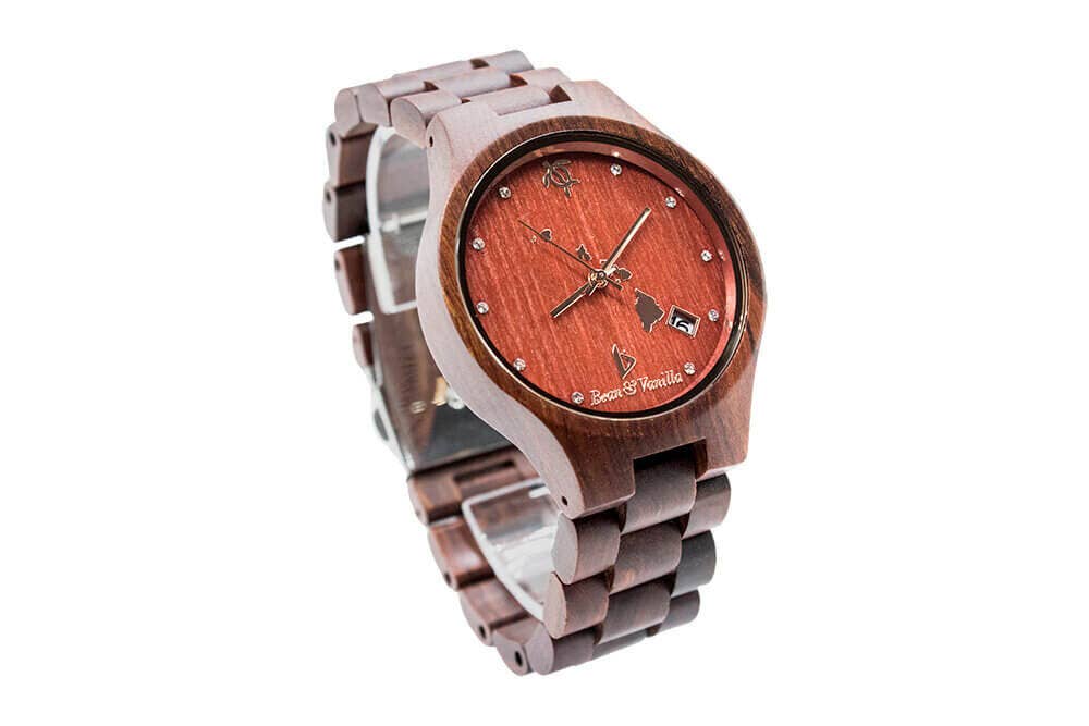Bean & Vanilla a débuté en 2010 à Honolulu, Hawaï. Inspirés par le magnifique paysage de l'île, nous avons décidé de créer une pièce intemporelle qui représente la belle nature et ce qu'elle donne à l'humanité. De Koa Woods sur les montagnes et paysages hawaïens à la nacre de notre riche océan, nous voulions que nos garde-temps nous rappellent que la nature n'est pas seulement là, mais qu'elle fait partie de nous tous les jours. Durabilité Nous croyons en la durabilité et encourageons la réutilisation, la réduction, la réaffectation et le recyclage dans le but de réduire la pression sur notre planète et de maintenir un équilibre écologique. Notre collection séduisante de bijoux et d'accessoires suit tous les principes de la durabilité. Protéger notre environnement Chez Bean & Vanilla, nous prenons soin de notre avenir. C'est pourquoi tous nos bijoux et montres en bois exquis sont fabriqués à partir de bois provenant de sources socialement responsables qui aident à maintenir et à renouveler la couverture forestière, protégeant ainsi notre planète et notre environnement.