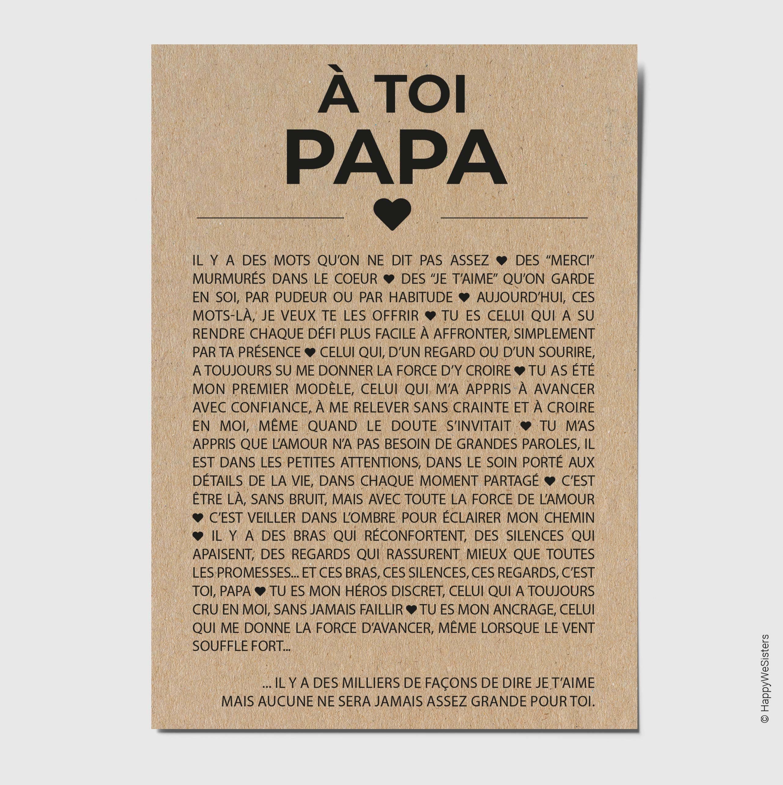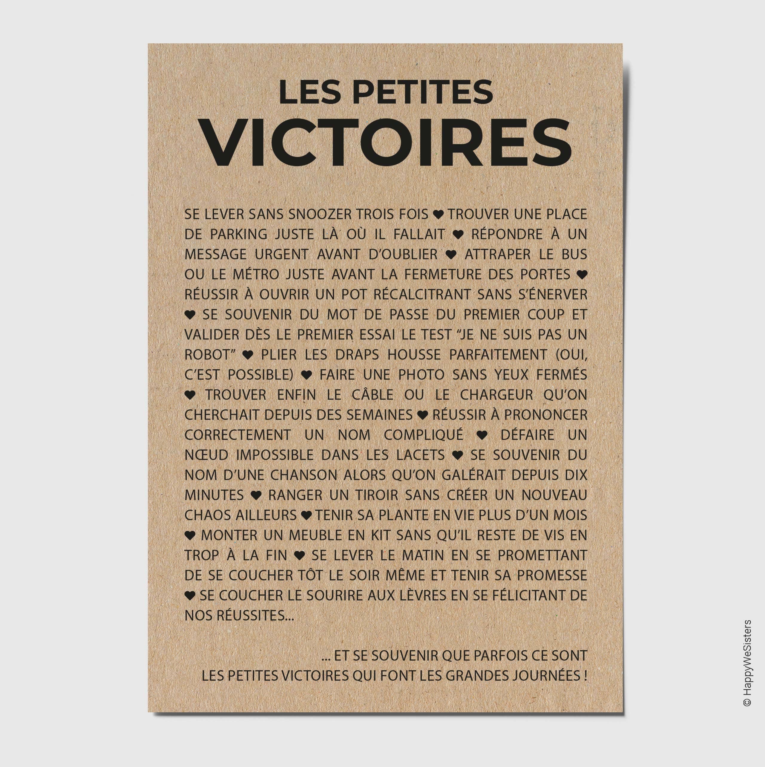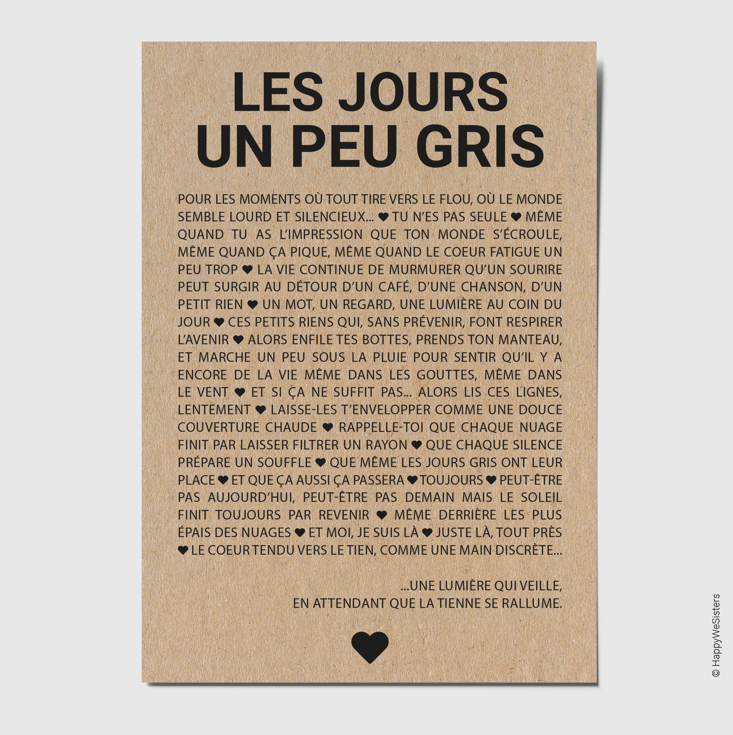 La marque HappyWeSisters est née du désir de véhiculer des messages positifs, inspirants et motivants. A travers des cartes de citations et à messages d'amitié, d'amour, d'encouragement, d'affection, permettre à chaque personne de se reconnaître, de faire le plein de bonheur et se sentir touchée en plein coeur tel est le but d'HappyWeSisters. Chaque carte est imprimée en France sur du papier naturel et éco-responsable fabriqué à base de fibres FSC® et de 10% de coques de cacao.