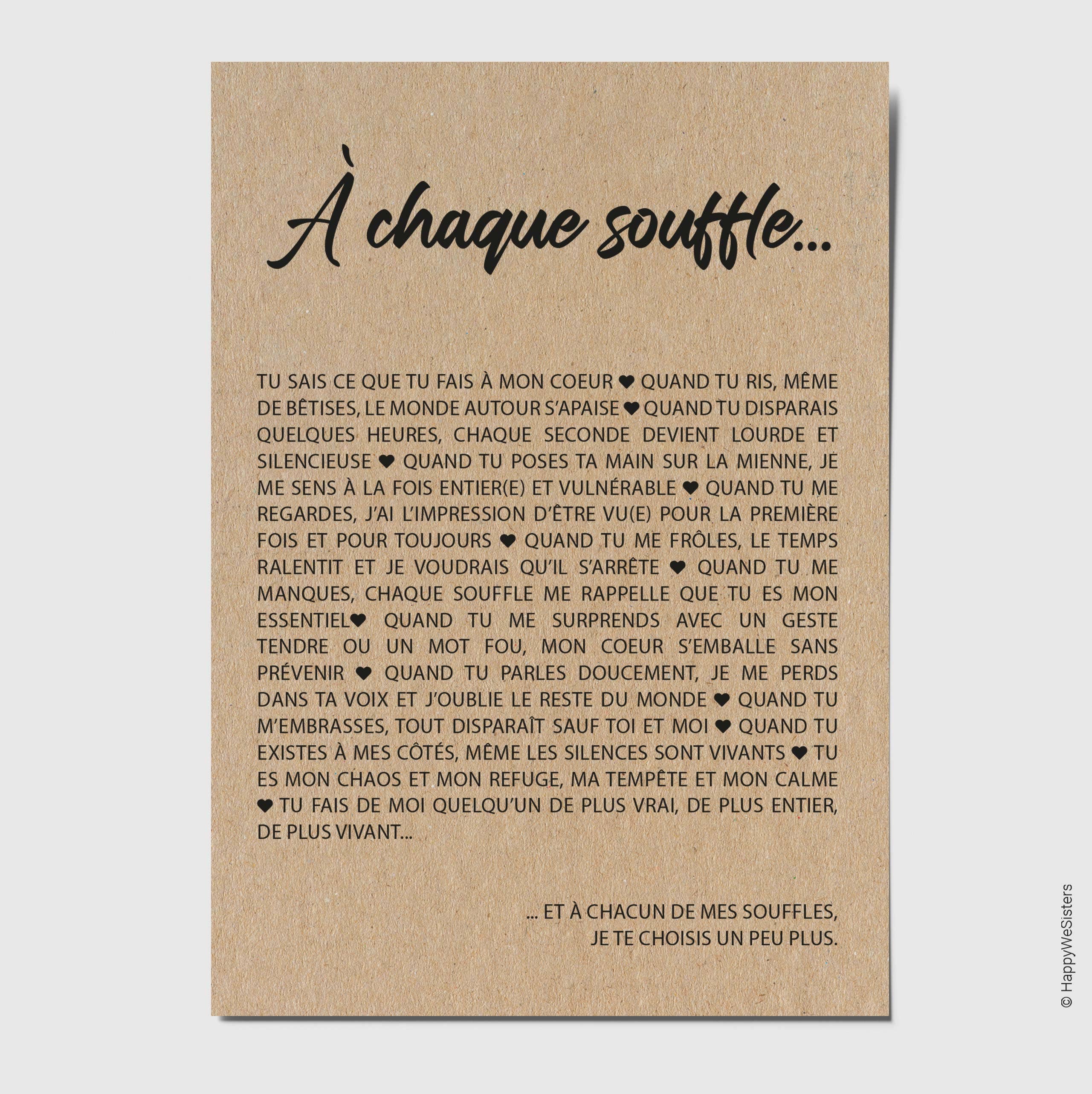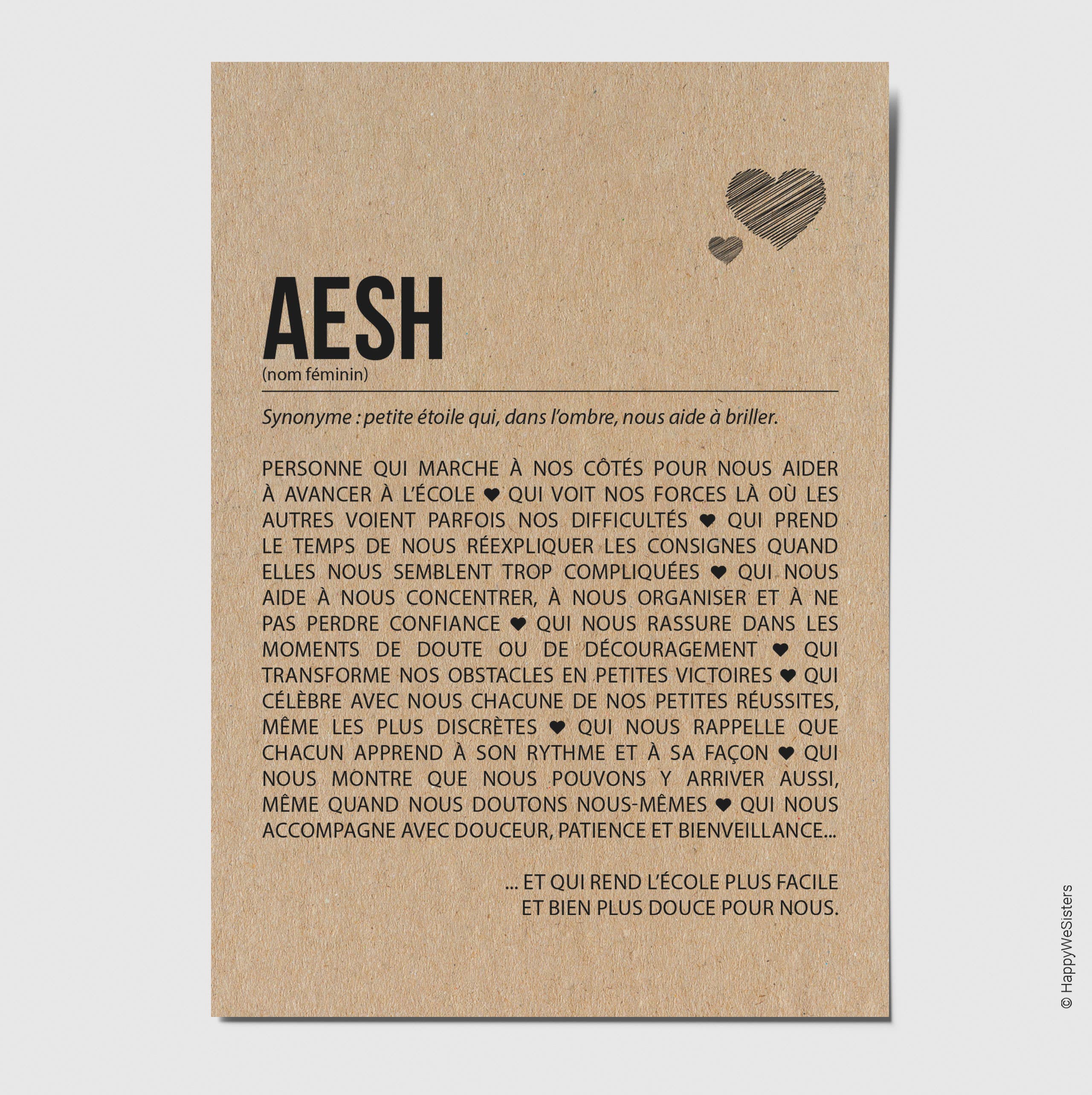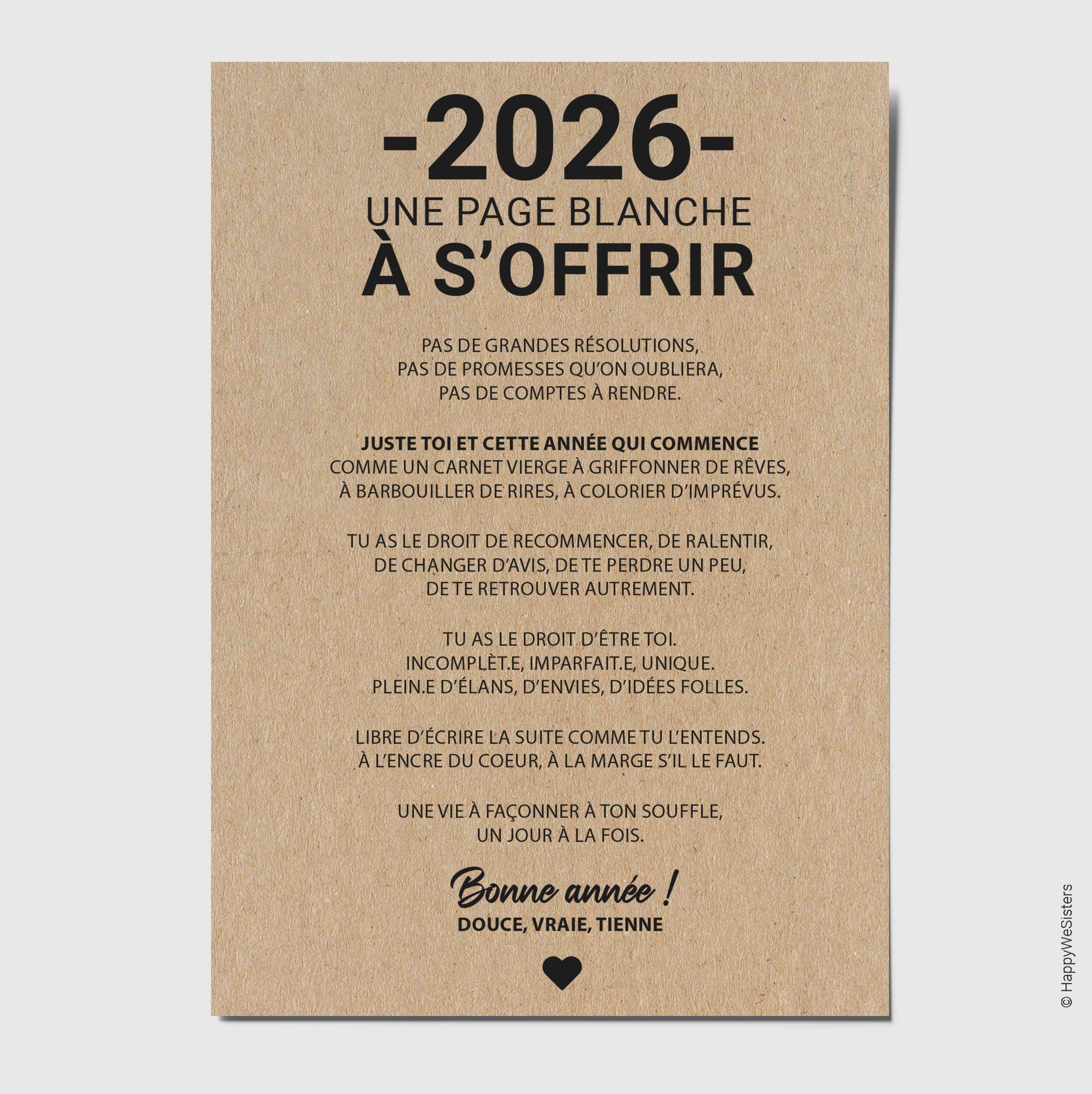 La marque HappyWeSisters est née du désir de véhiculer des messages positifs, inspirants et motivants. A travers des cartes de citations et à messages d'amitié, d'amour, d'encouragement, d'affection, permettre à chaque personne de se reconnaître, de faire le plein de bonheur et se sentir touchée en plein coeur tel est le but d'HappyWeSisters. Chaque carte est imprimée en France sur du papier naturel et éco-responsable fabriqué à base de fibres FSC® et de 10% de coques de cacao.