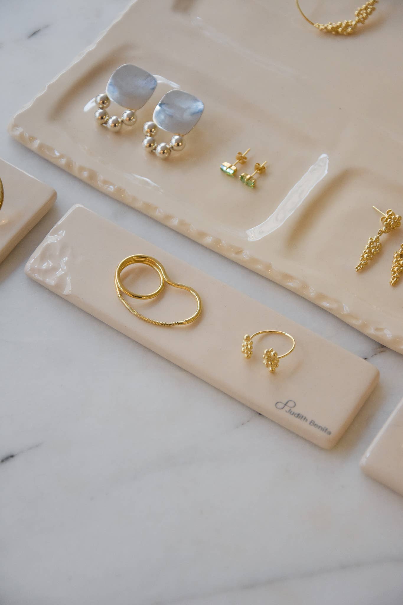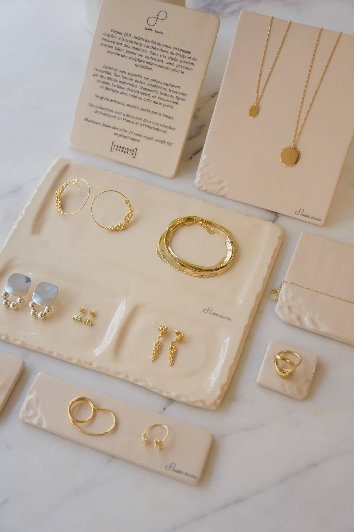 Depuis la création de la marque en 2011, nous proposons une lecture différente du bijou en ne dérogeant pas à nos principes fondateurs : voir les choses sous un autre angle, laisser toute sa place au temps, à la précision du geste et cultiver l’inattendu. Dépourvues de tout superflu comme un objet dont on aurait retenu que l’essentiel, les bijoux Judith Benita conjuguent sens de l’asymétrie, lignes graphiques et exploration de la couleur. Un vocabulaire développé saison après saison, une identité forte déclinée au fil des collections.En laiton doré à l’or fin ou plaqué or, nos pièces sont toutes pensées et façonnées à la main en France, à Paris dans notre studio de création.