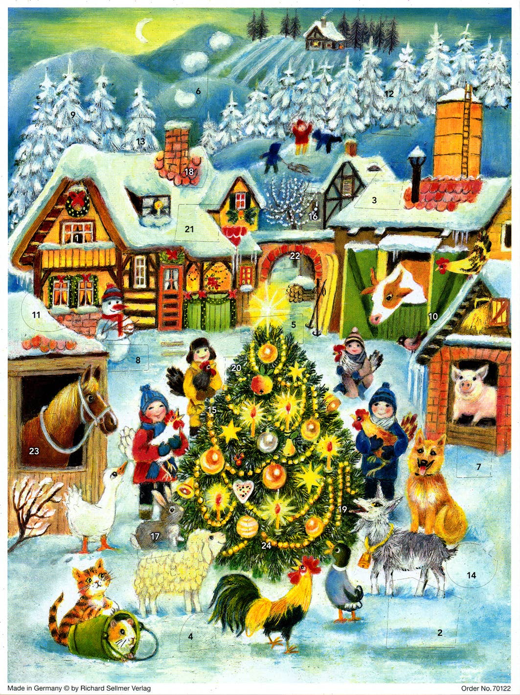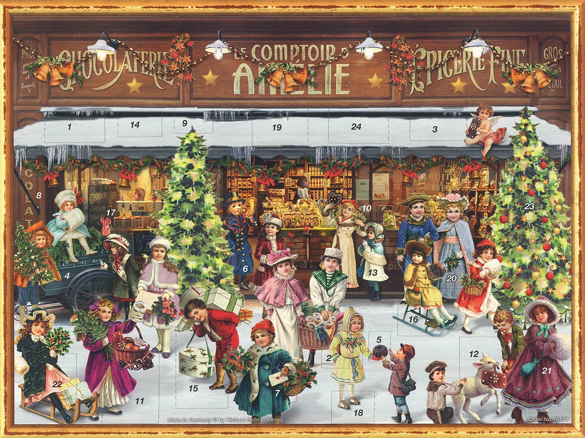 Les paysages urbains nostalgiques, les scènes de Noël chaleureuses, les paysages enneigés romantiques avec le Père Noël et les motifs religieux des calendriers de l'Avent, particulièrement appréciés en Angleterre, ont un point commun : ils sont conçus et fabriqués avec soin et souci du détail. Les autorités d'occupation américaines ont autorisé l'impression en 1945. Bien qu'une grande partie de la saison de l'Avent de la première année d'après-guerre soit déjà terminée, le calendrier de Sellmer a connu un grand succès. Il a donc progressivement élargi le programme au cours des années suivantes. Richard Sellmer a rapidement établi des contacts avec des clients américains par le biais de salons internationaux. Le calendrier de l'Avent, jusqu'alors totalement inconnu aux États-Unis, y a également trouvé des acheteurs enthousiastes. Les clients américains pouvaient désormais également acheter le calendrier de l'Avent de Sellmer. Sellmers Verlag a rapidement été surnommée « la maison du calendrier de l'Avent ». Les somptueux albums photos, qui retracent l'histoire de l'entreprise, contiennent des photos en noir et blanc des premières productions ainsi que des lettres d'enfants du monde entier adressées au « Secrétaire général du Père Noël » ou au « Père Noël ». Les calendriers de l'Avent Sellmer sont respectueux de l'environnement : carton recyclé sur la face avant, paillettes biodégradables, enveloppés dans un film recyclable.