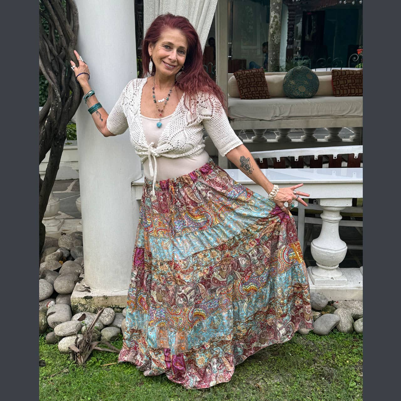 Jayli Clothing est une petite entreprise familiale avec des racines à la fois dans la musique et le voyage. Comme nous aimons le dire, Jayli est née "de la poussière des morts". Notre histoire a commencé lorsque Jay, originaire du nord de la Californie, a rencontré Liora, originaire du Cap, en Afrique du Sud, alors qu'ils voyageaient tous deux en Inde. Peu de temps après, Jay-Li (JAYLI Clothing) a été créé. Ce qui a commencé par la vente de nos produits artisanaux sur les marchés de producteurs et lors des concerts des Grateful Dead s'est rapidement transformé en notre premier compte de vente en gros—et à partir de là, le voyage n'a fait que s'épanouir. À ce jour, nous continuons à vendre lors de festivals sur la côte ouest chaque été, simplement parce que nous aimons cela (et nos deux jeunes filles aussi). Depuis 30 ans, nous voyageons chaque année au Népal et en Thaïlande, travaillant en étroite collaboration avec les mêmes petites usines familiales. Au fil du temps, nous avons construit des relations personnelles et professionnelles profondes avec les maîtres coupeurs, tailleurs, brodeurs, teinturiers et emballeurs qui aident à donner vie à nos créations.