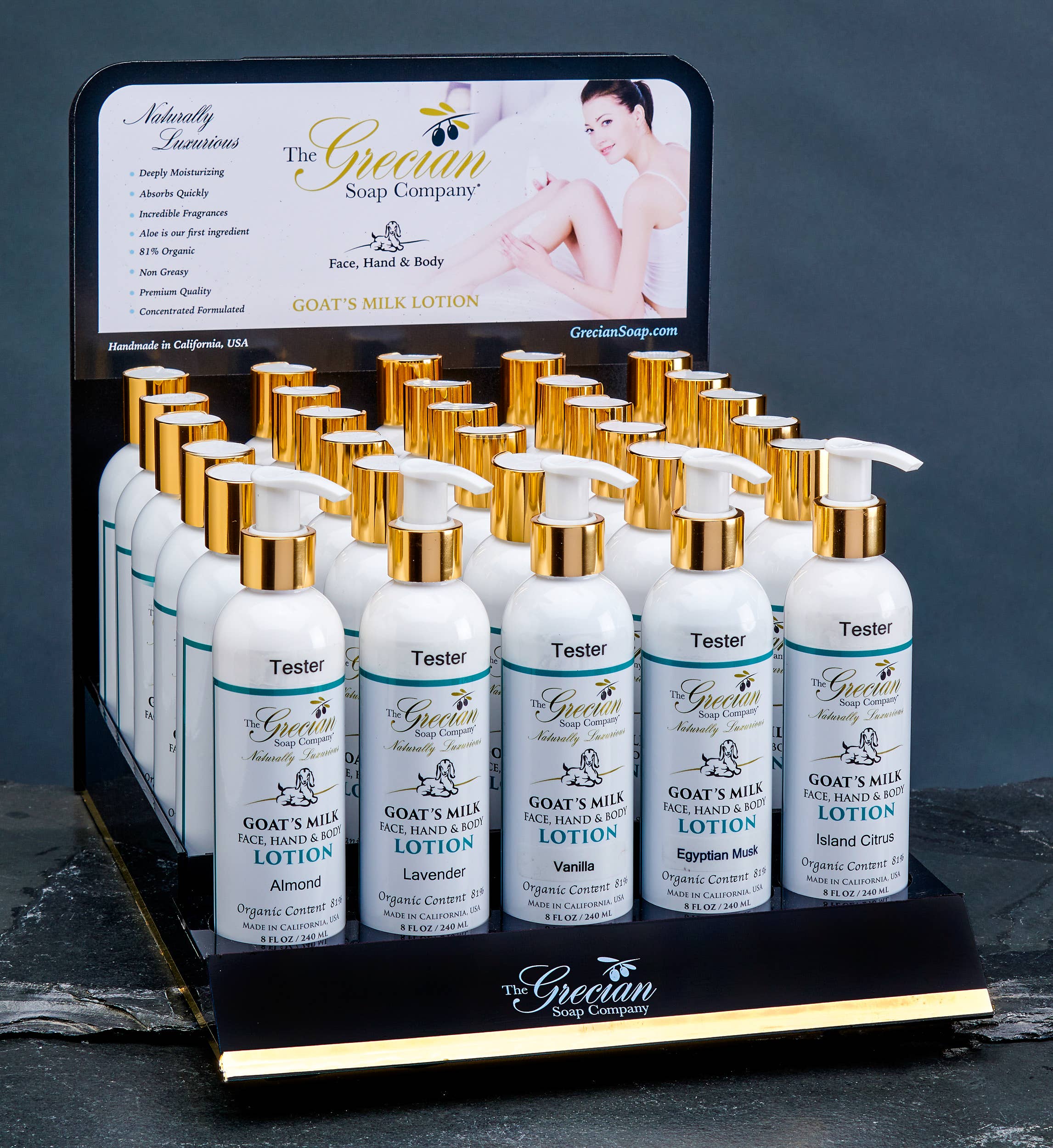 La Grecian Soap Company, une entreprise familiale de 10 ans, a été créée dans le but de proposer des produits uniques de haute qualité qui fonctionnent et sont à un prix raisonnable en utilisant des ingrédients naturels. Lorsque nous avons essayé pour la première fois le savon au lait de chèvre, cela nous a fait réaliser à quel point un savon peut améliorer la sensation de votre peau, sans parler des bienfaits du lait de chèvre et de l'huile d'olive. Ainsi, avec cette idée en tête, nous avons décidé de lancer notre entreprise avec une approche unique d'amélioration du produit en éliminant les parabènes, les sulfates et autres produits chimiques agressifs. Nous voulions également offrir une grande variété de parfums et créer un emballage qui attire les gens. À ce jour, nous vendons nos produits dans plus de 1900 magasins et nous nous développons chaque semaine. Certains de nos produits les plus vendus incluent nos lotions biologiques au lait de chèvre, disponibles en bouteilles de 8 oz et en tubes de 2 oz, nos savons au lait de chèvre avec une éponge de mer naturelle intégrée dans le savon et nos savons de formes uniques pour accompagner divers thèmes tels que la plage ou le désert.