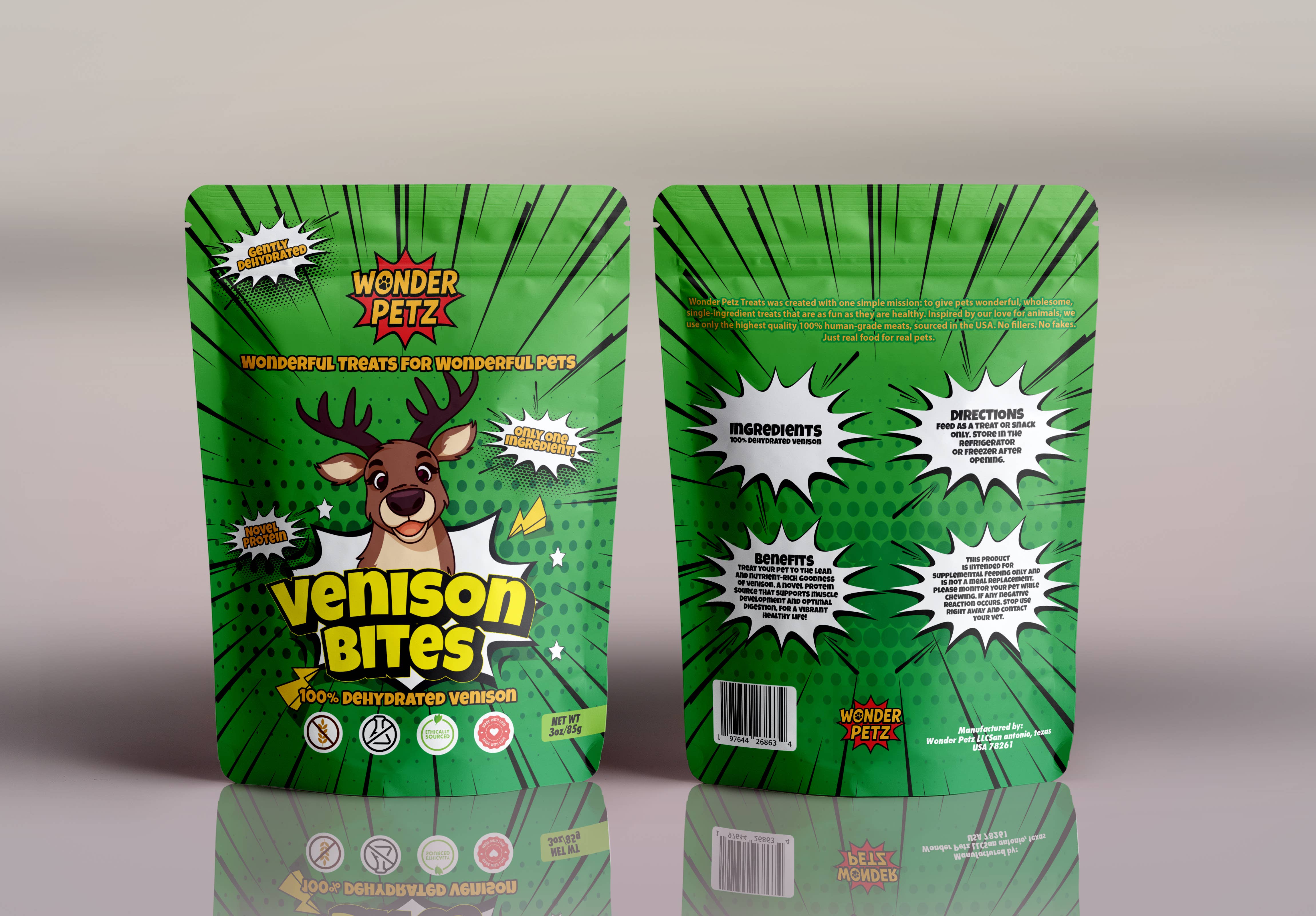 Bienvenue à tous les Wonder Petz ! Mon entreprise a été inspirée par mon propre Wonder Pup, Finn, pour son ventre très sensible (tout comme ses mamans !). Nous sommes spécialisés dans les protéines déshydratées à ingrédient unique et les garnitures de repas. Wonder Petz croit en l'importance de nourrir les animaux de compagnie naturellement, comme la nature l'a voulu. Cela implique de rester simple et de revenir à l'essentiel. Les chiens ont besoin d'une alimentation équilibrée, difficile à obtenir uniquement avec des croquettes sèches. Nos friandises agrémentent les repas et agrémentent les saveurs, même pour les mangeurs les plus exigeants.