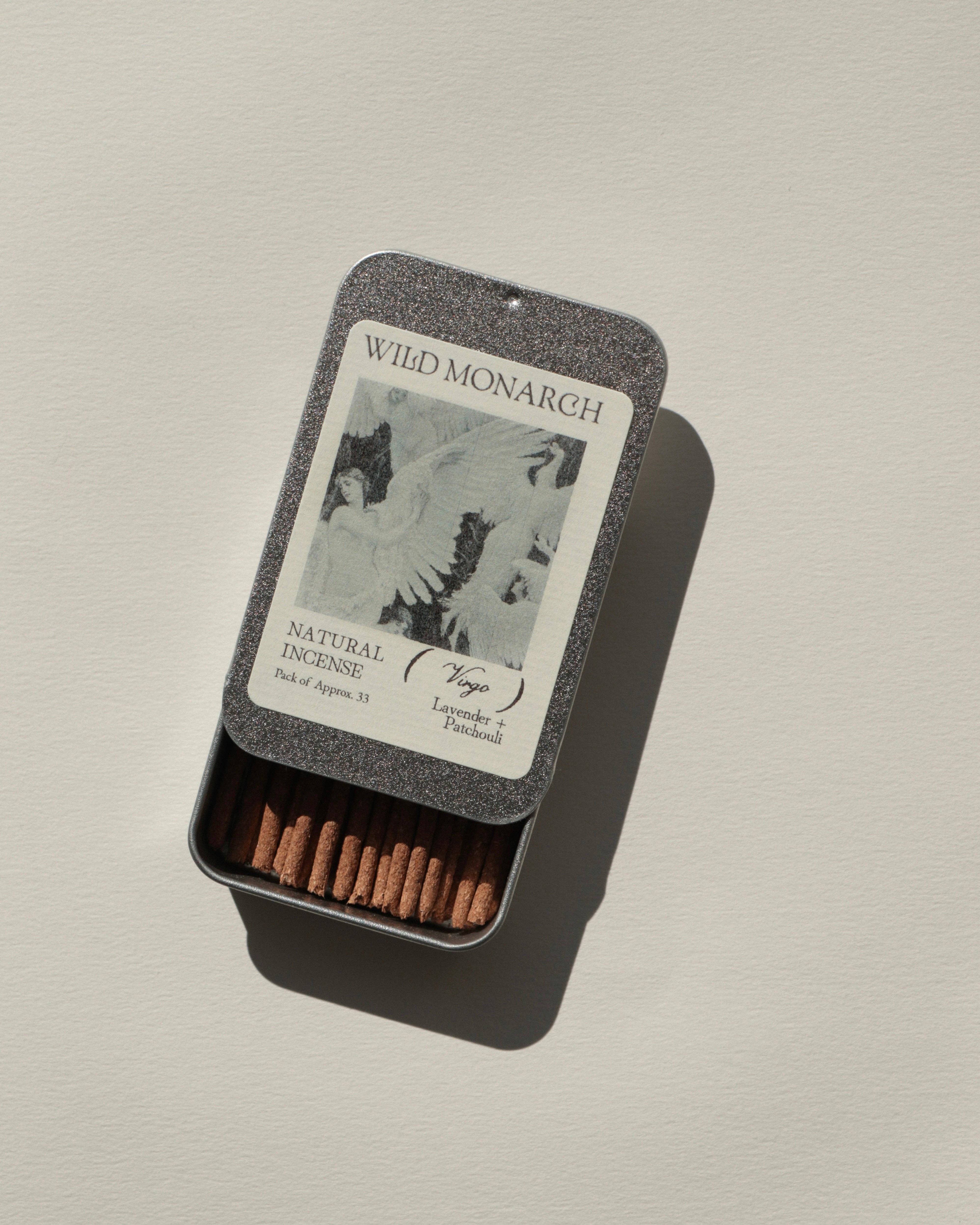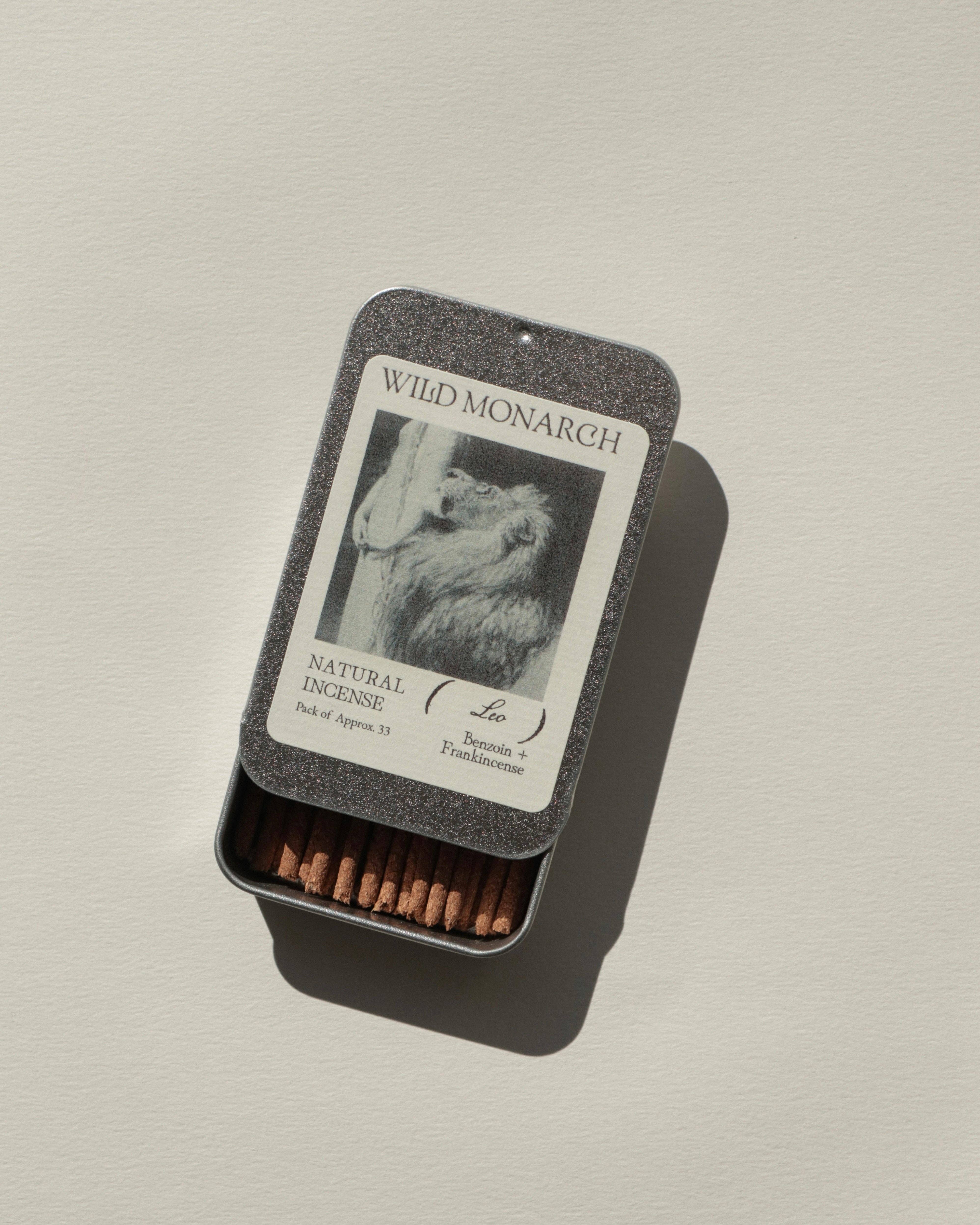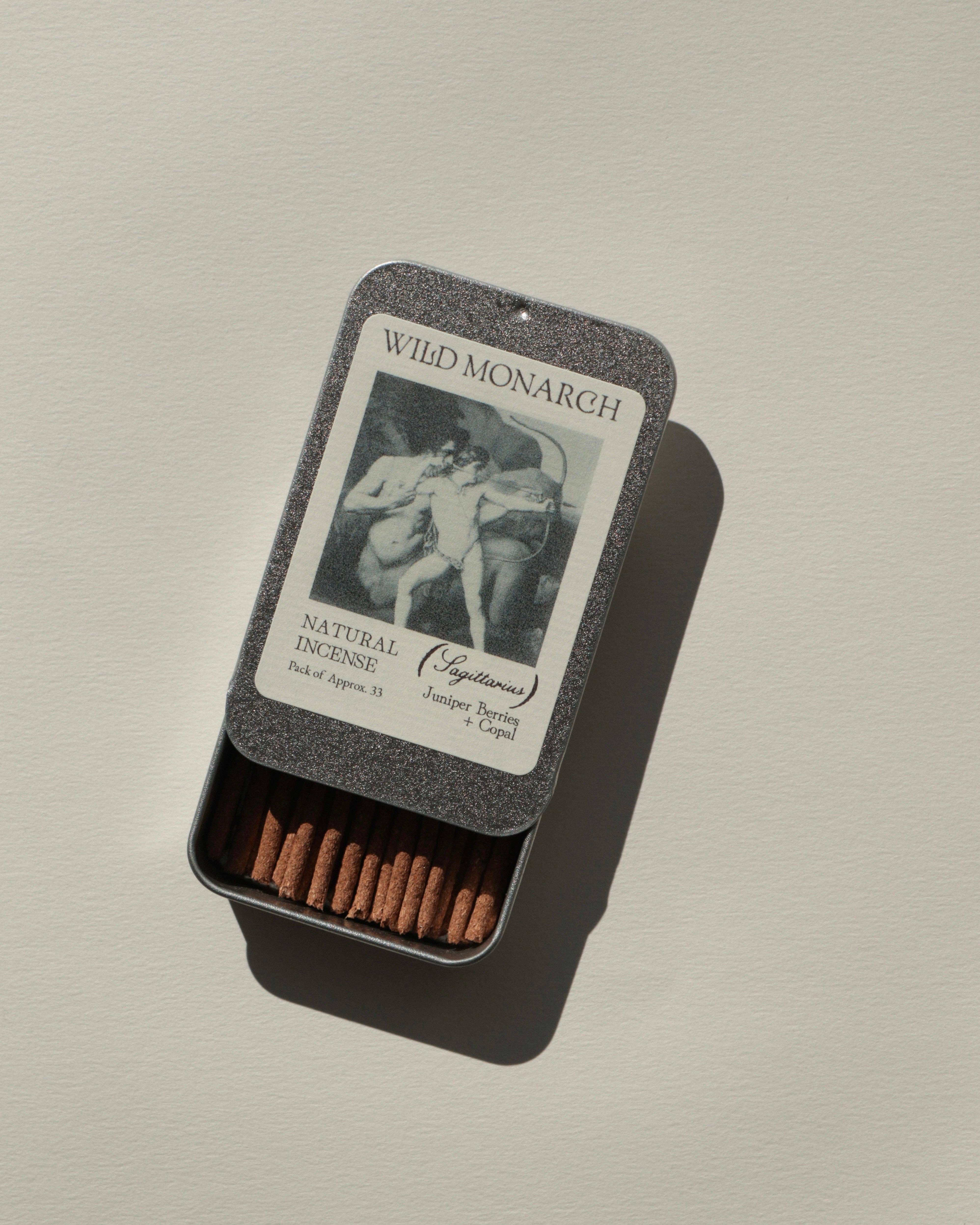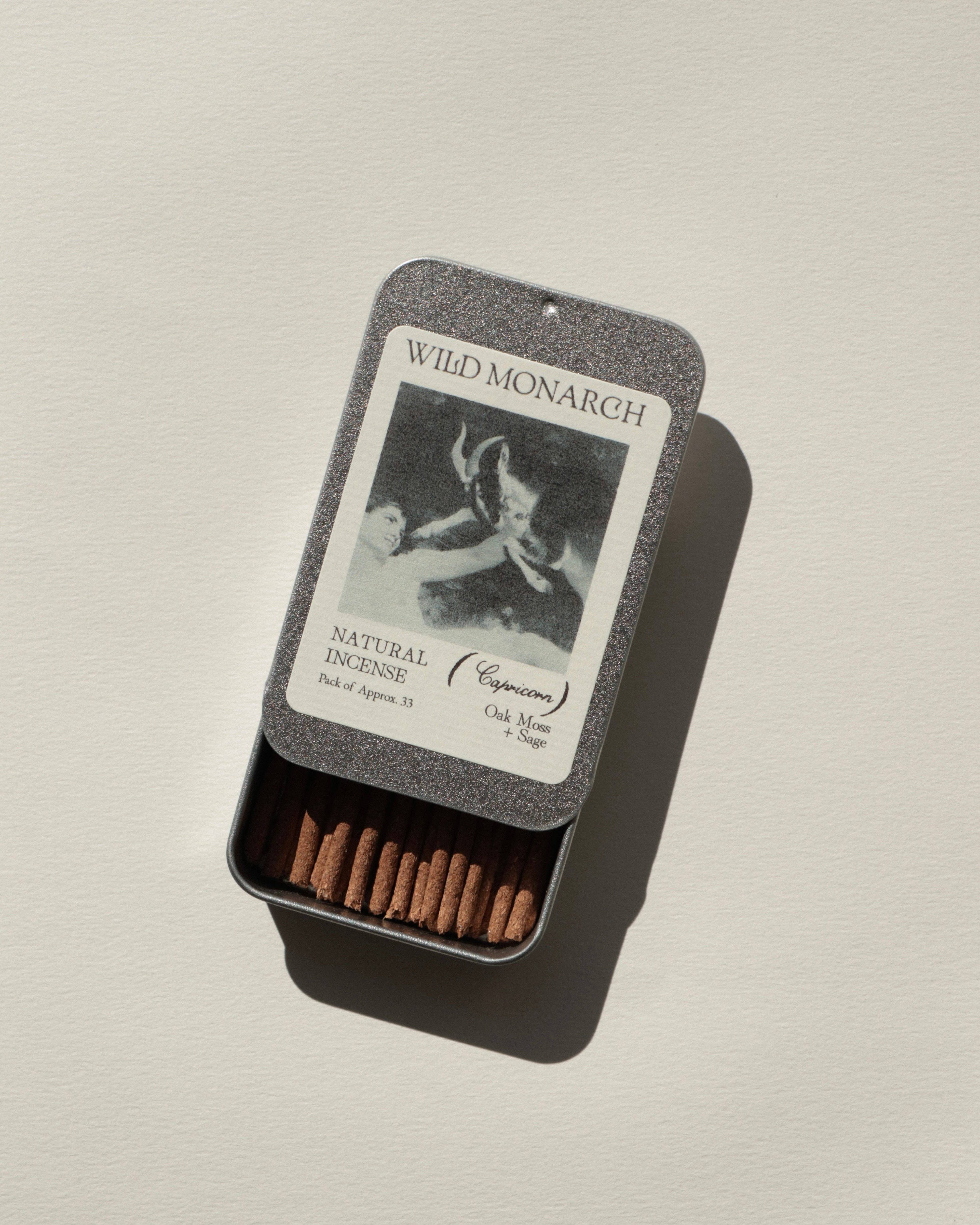 Inspiré par l'ancien et le sacré, l'encens naturel de Wild Monarch est composé uniquement d'herbes aromatiques, de résines d'arbres, de bois et d'huiles essentielles. Chaque bâton d'encens est fabriqué à la main du début à la fin et emballé dans une boîte en étain réutilisable avec des étiquettes biodégradables pour une expérience zéro déchet. 100% Naturel, Végan + Fait à la main