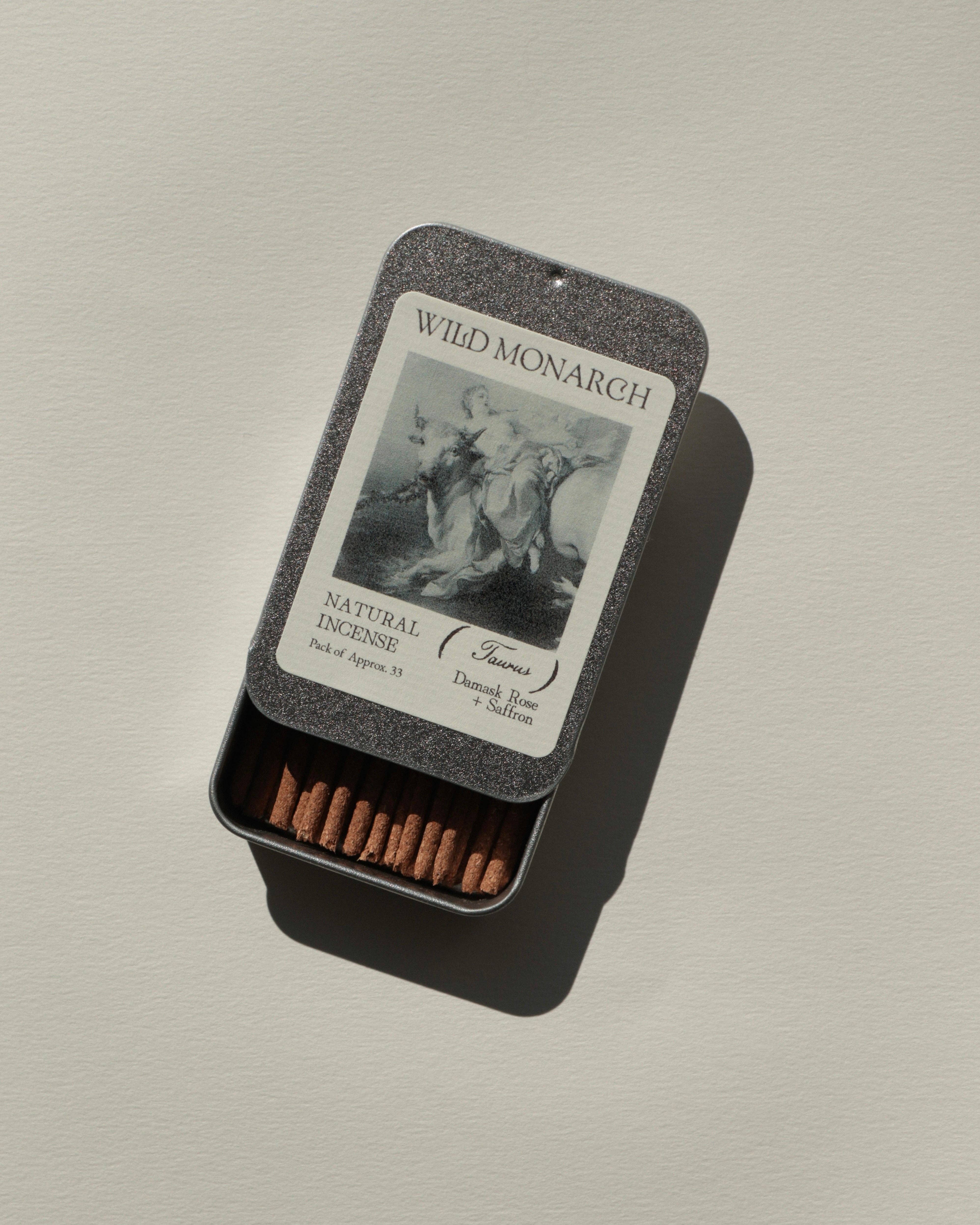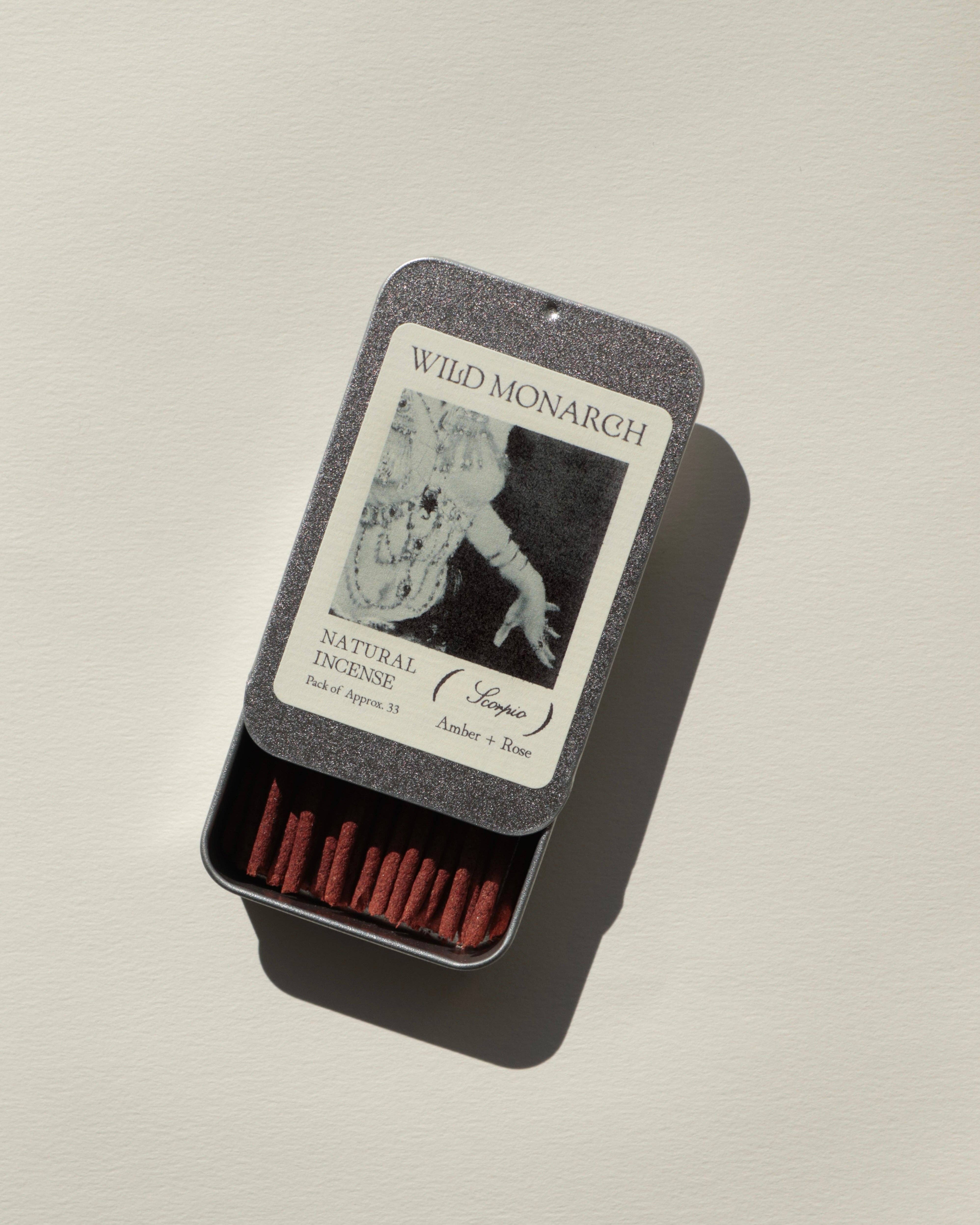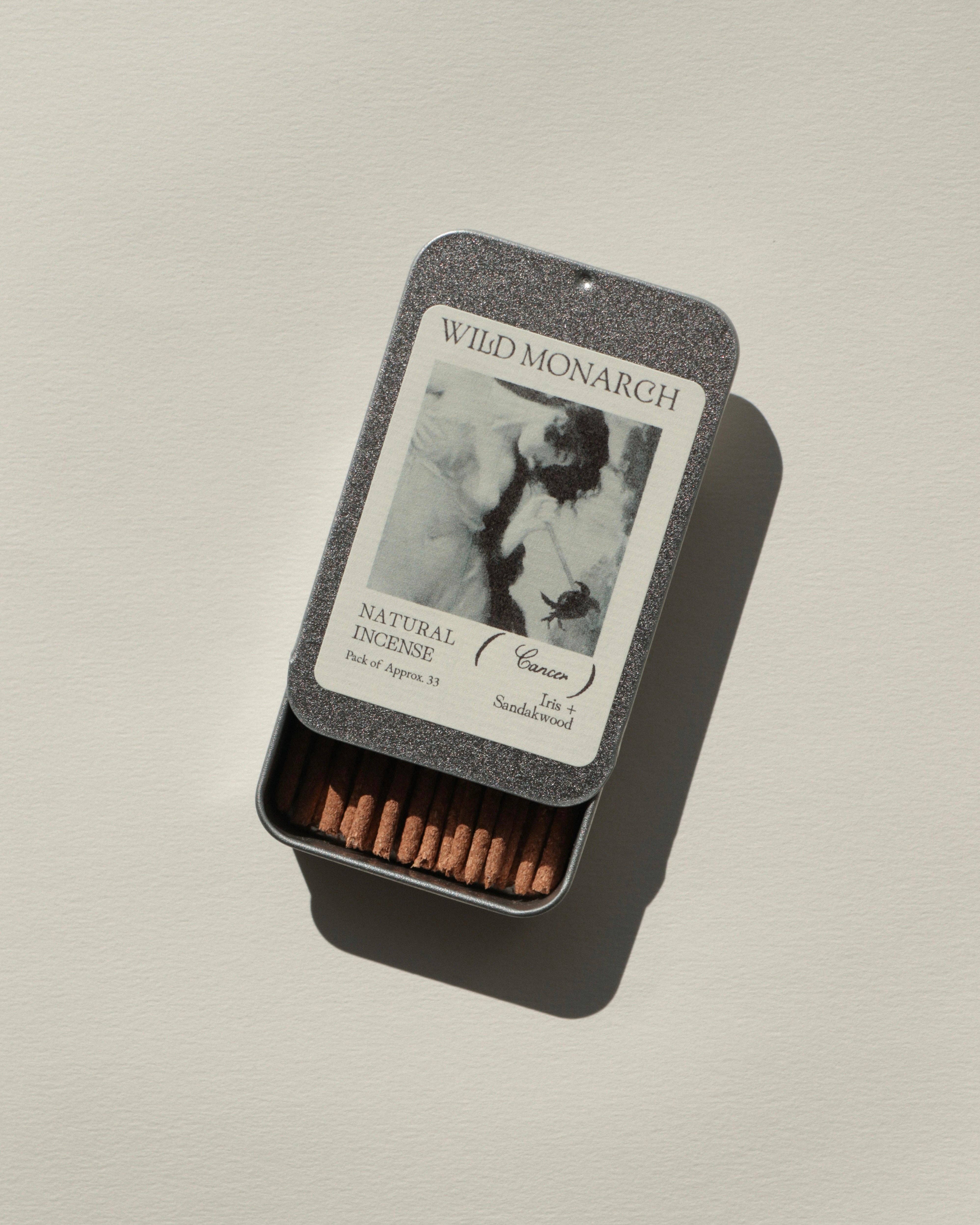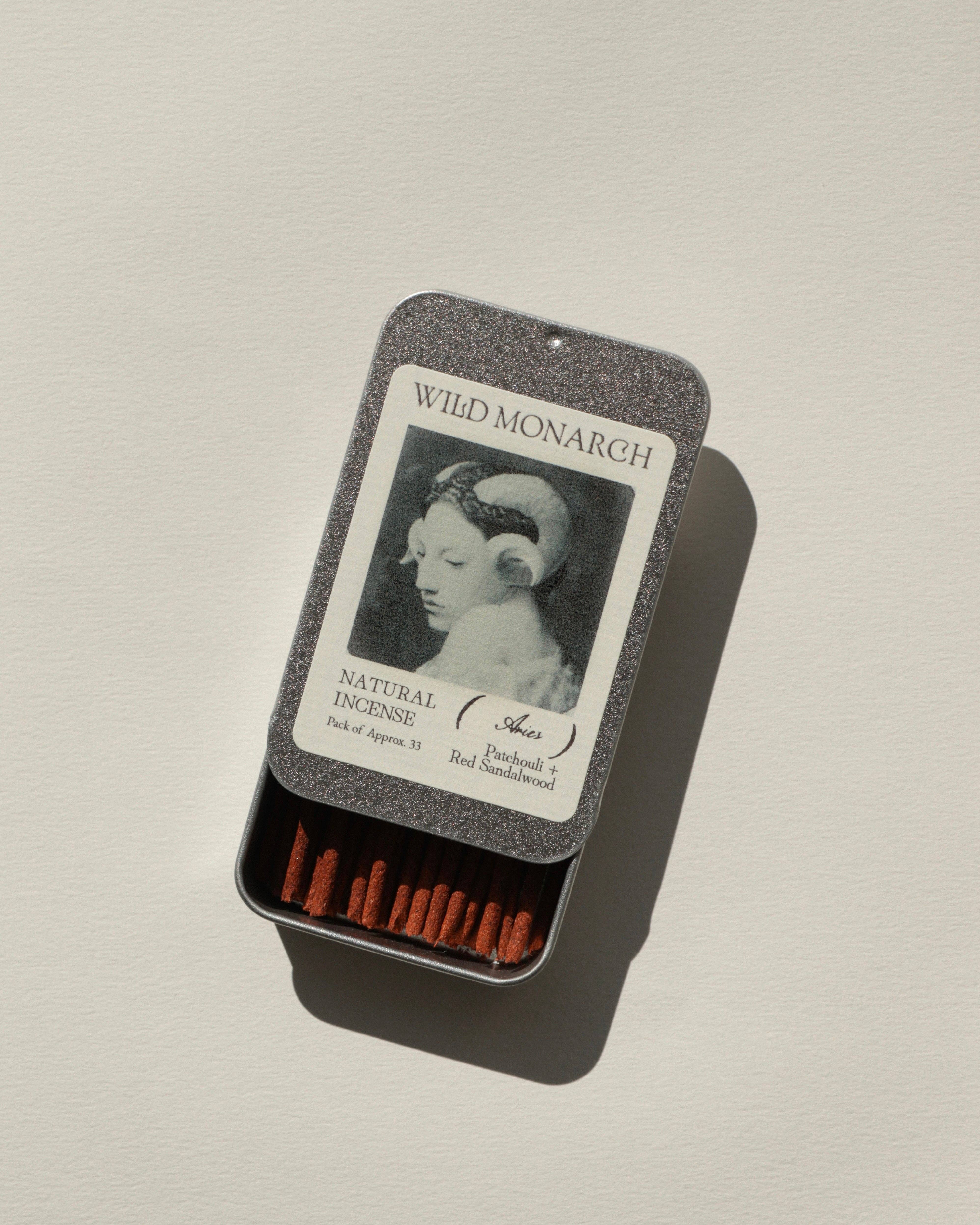 Inspiré par l'ancien et le sacré, l'encens naturel de Wild Monarch est composé uniquement d'herbes aromatiques, de résines d'arbres, de bois et d'huiles essentielles. Chaque bâton d'encens est fabriqué à la main du début à la fin et emballé dans une boîte en étain réutilisable avec des étiquettes biodégradables pour une expérience zéro déchet. 100% Naturel, Végan + Fait à la main